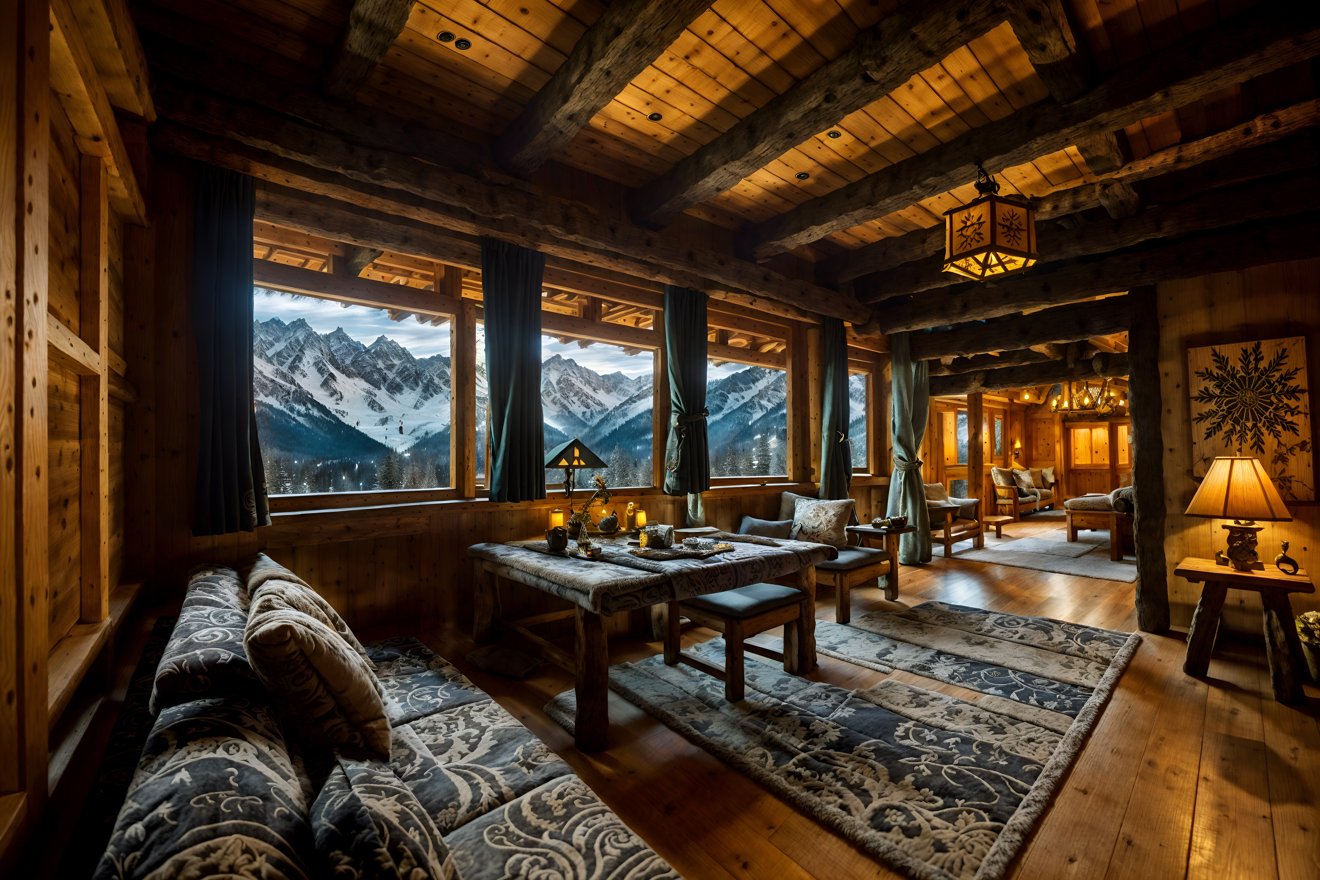photo from pinterest of ski chalet-style interior designed (onsen interior) . with nature-inspired and richly patterned fabrics and mountain-inspired and exposed construction beams and layered textiles and animal furs and decorative carving and mouldings and wooden walls. . cinematic photo, highly detailed, cinematic lighting, ultra-detailed, ultrarealistic, photorealism, 8k. trending on pinterest. ski chalet interior design style. masterpiece, cinematic light, ultrarealistic+, photorealistic+, 8k, raw photo, realistic, sharp focus on eyes, (symmetrical eyes), (intact eyes), hyperrealistic, highest quality, best quality, , highly detailed, masterpiece, best quality, extremely detailed 8k wallpaper, masterpiece, best quality, ultra-detailed, best shadow, detailed background, detailed face, detailed eyes, high contrast, best illumination, detailed face, dulux, caustic, dynamic angle, detailed glow. dramatic lighting. highly detailed, insanely detailed hair, symmetrical, intricate details, professionally retouched, 8k high definition. strong bokeh. award winning photo.