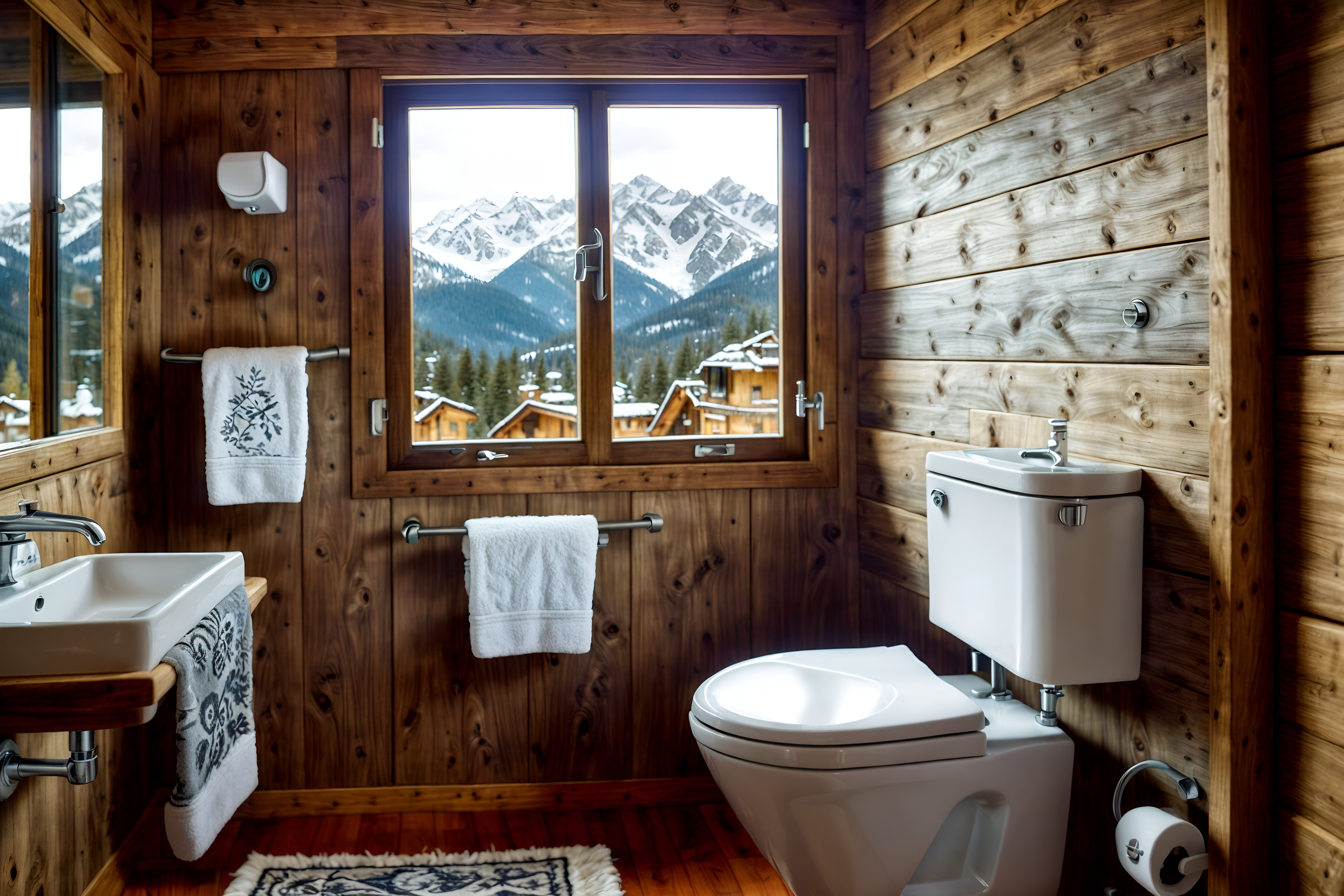 photo from pinterest of ski chalet-style interior designed (toilet interior) with sink with tap and toilet paper hanger and toilet with toilet seat up and sink with tap. . with exposed wood and richly patterned fabrics and exposed timber and animal furs and window with mountain views and animal rugs and layered textiles and mountain-inspired. . cinematic photo, highly detailed, cinematic lighting, ultra-detailed, ultrarealistic, photorealism, 8k. trending on pinterest. ski chalet interior design style. masterpiece, cinematic light, ultrarealistic+, photorealistic+, 8k, raw photo, realistic, sharp focus on eyes, (symmetrical eyes), (intact eyes), hyperrealistic, highest quality, best quality, , highly detailed, masterpiece, best quality, extremely detailed 8k wallpaper, masterpiece, best quality, ultra-detailed, best shadow, detailed background, detailed face, detailed eyes, high contrast, best illumination, detailed face, dulux, caustic, dynamic angle, detailed glow. dramatic lighting. highly detailed, insanely detailed hair, symmetrical, intricate details, professionally retouched, 8k high definition. strong bokeh. award winning photo.