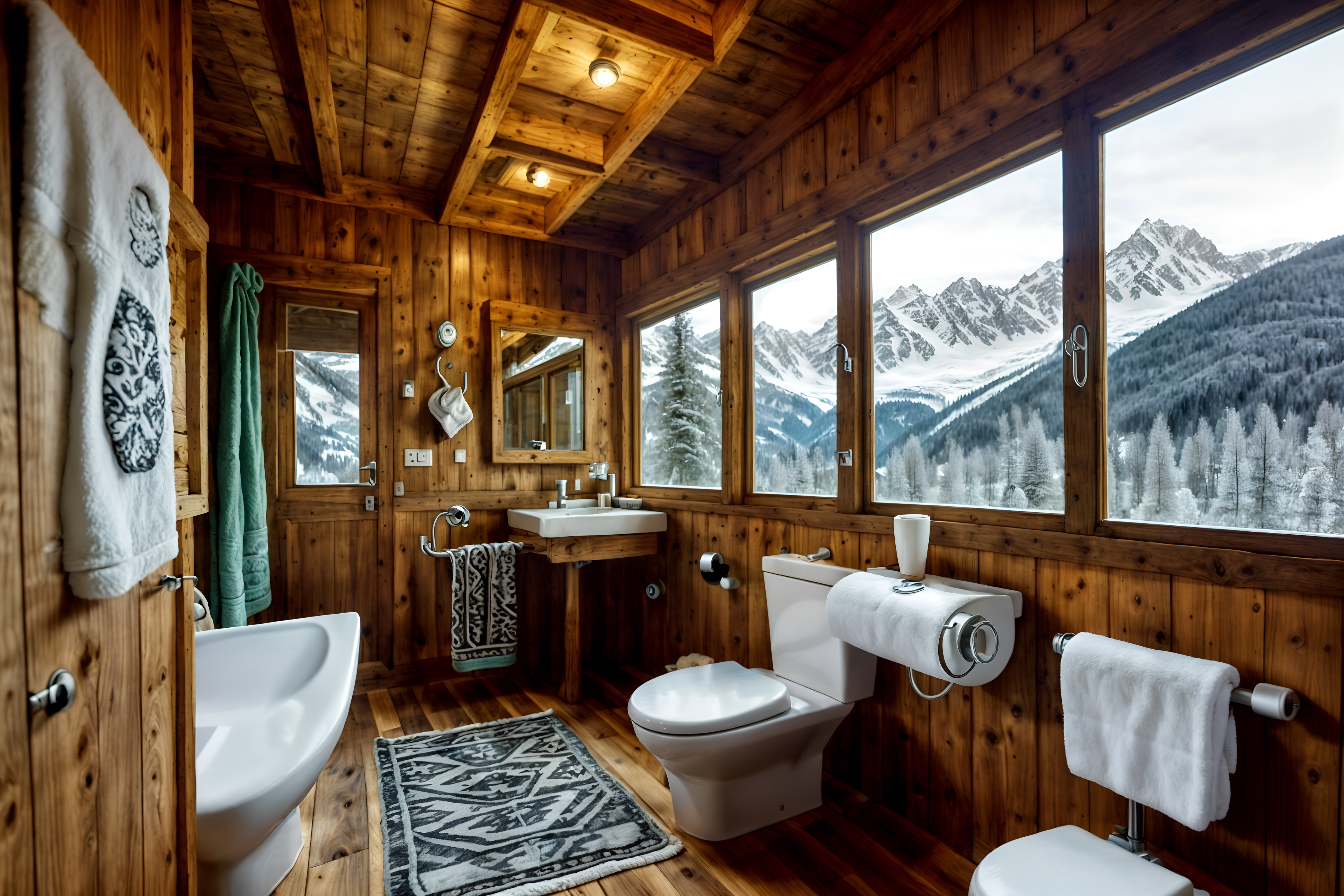 photo from pinterest of ski chalet-style interior designed (toilet interior) with sink with tap and toilet paper hanger and toilet with toilet seat up and sink with tap. . with exposed wood and richly patterned fabrics and exposed timber and animal furs and window with mountain views and animal rugs and layered textiles and mountain-inspired. . cinematic photo, highly detailed, cinematic lighting, ultra-detailed, ultrarealistic, photorealism, 8k. trending on pinterest. ski chalet interior design style. masterpiece, cinematic light, ultrarealistic+, photorealistic+, 8k, raw photo, realistic, sharp focus on eyes, (symmetrical eyes), (intact eyes), hyperrealistic, highest quality, best quality, , highly detailed, masterpiece, best quality, extremely detailed 8k wallpaper, masterpiece, best quality, ultra-detailed, best shadow, detailed background, detailed face, detailed eyes, high contrast, best illumination, detailed face, dulux, caustic, dynamic angle, detailed glow. dramatic lighting. highly detailed, insanely detailed hair, symmetrical, intricate details, professionally retouched, 8k high definition. strong bokeh. award winning photo.