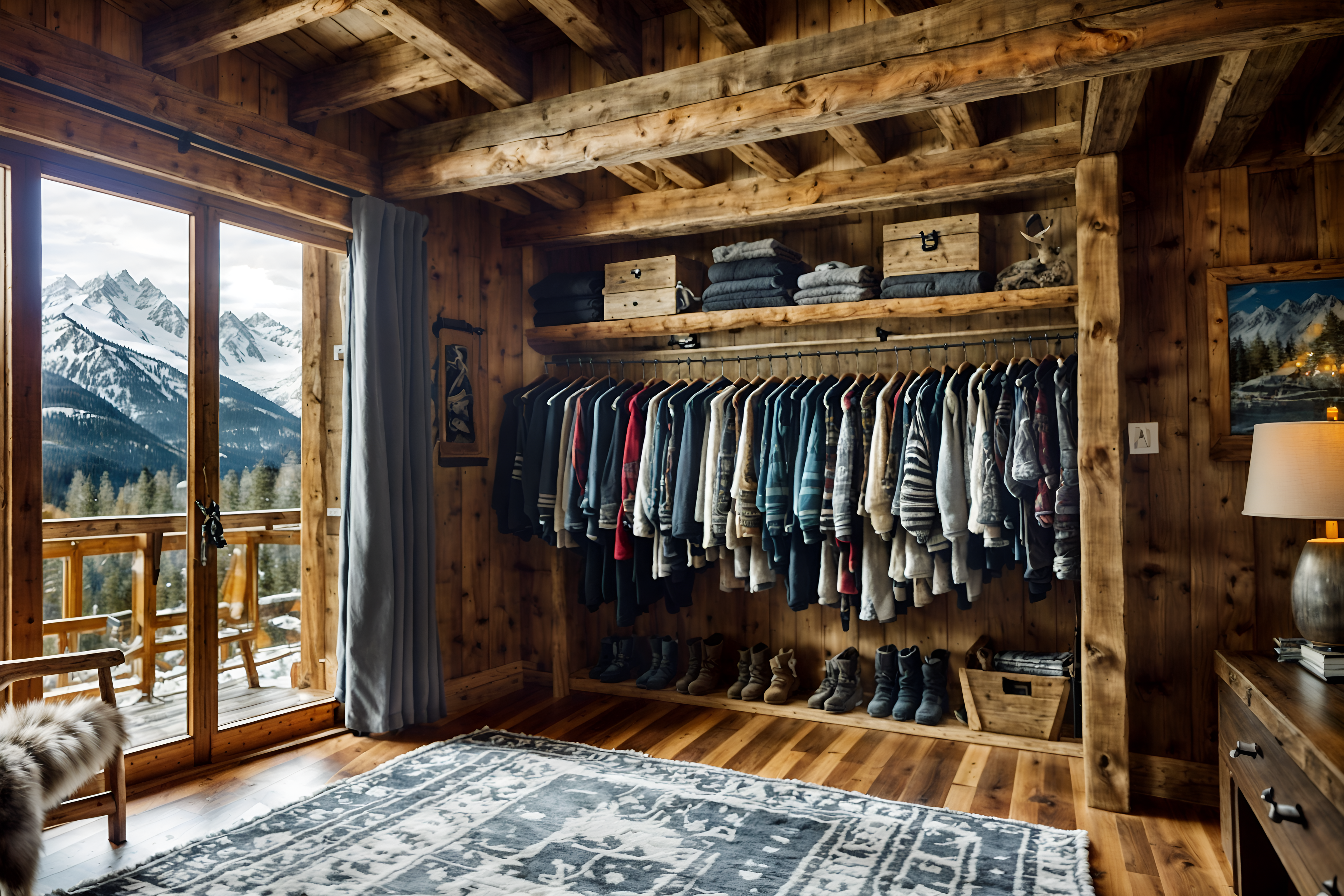 photo from pinterest of ski chalet-style interior designed (walk in closet interior) . with exposed timber and window with mountain views and layered textiles and exposed construction beams and animal furs and ski-themed decor and animal rugs and hanging wall elk antler. . cinematic photo, highly detailed, cinematic lighting, ultra-detailed, ultrarealistic, photorealism, 8k. trending on pinterest. ski chalet interior design style. masterpiece, cinematic light, ultrarealistic+, photorealistic+, 8k, raw photo, realistic, sharp focus on eyes, (symmetrical eyes), (intact eyes), hyperrealistic, highest quality, best quality, , highly detailed, masterpiece, best quality, extremely detailed 8k wallpaper, masterpiece, best quality, ultra-detailed, best shadow, detailed background, detailed face, detailed eyes, high contrast, best illumination, detailed face, dulux, caustic, dynamic angle, detailed glow. dramatic lighting. highly detailed, insanely detailed hair, symmetrical, intricate details, professionally retouched, 8k high definition. strong bokeh. award winning photo.