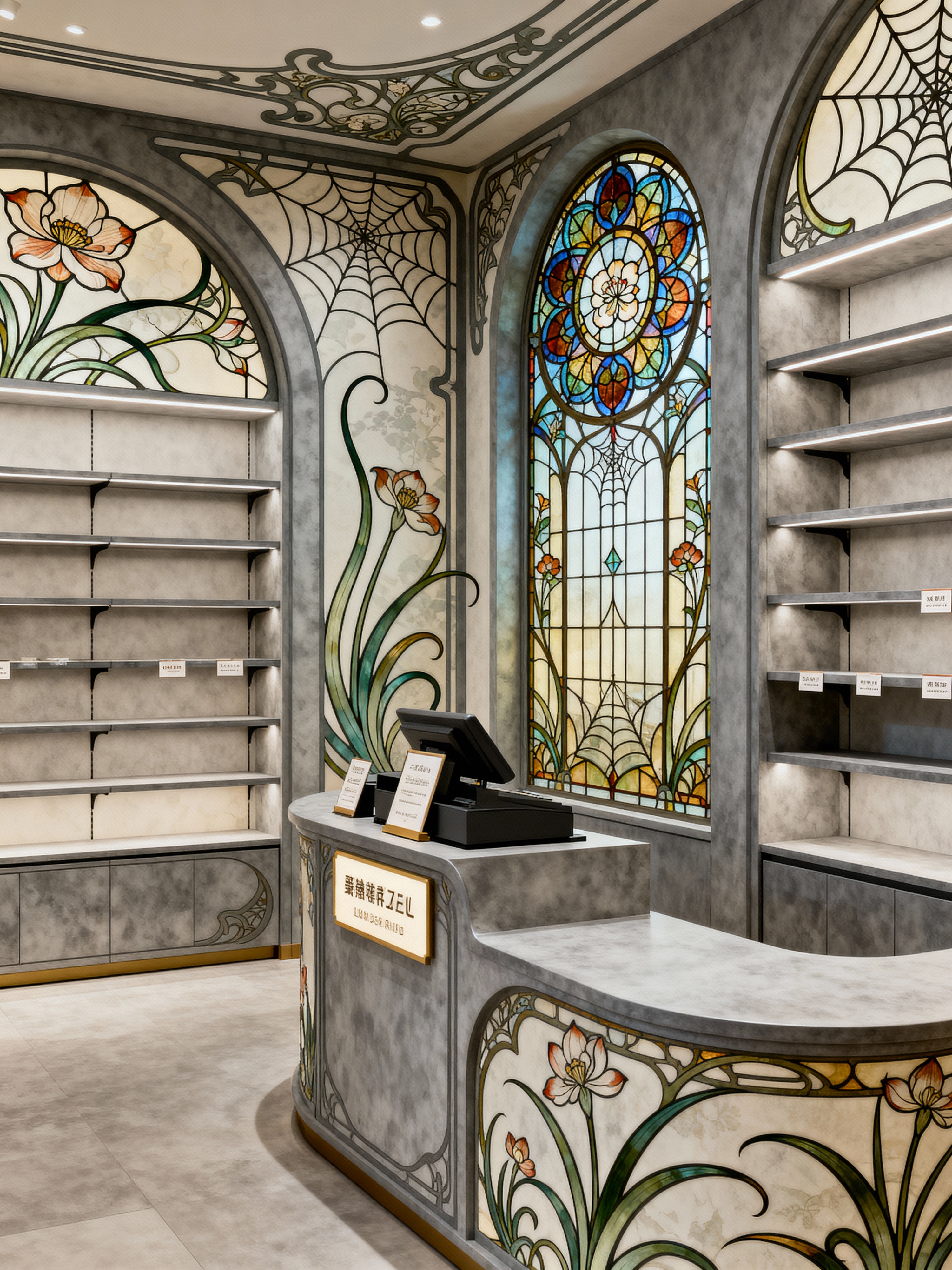 store with art nouveau style with shelving units and display racks and signage and labels and store fixtures and fittings and cash register or point of sale system and shelving units. . with asymmetrical shapes and japanese motifs and curving, plant-like embellishments and wallpaper patterns of stylized flowers and ashy colors and arches and curved forms and wallpaper pattners of spider webs and stained glass