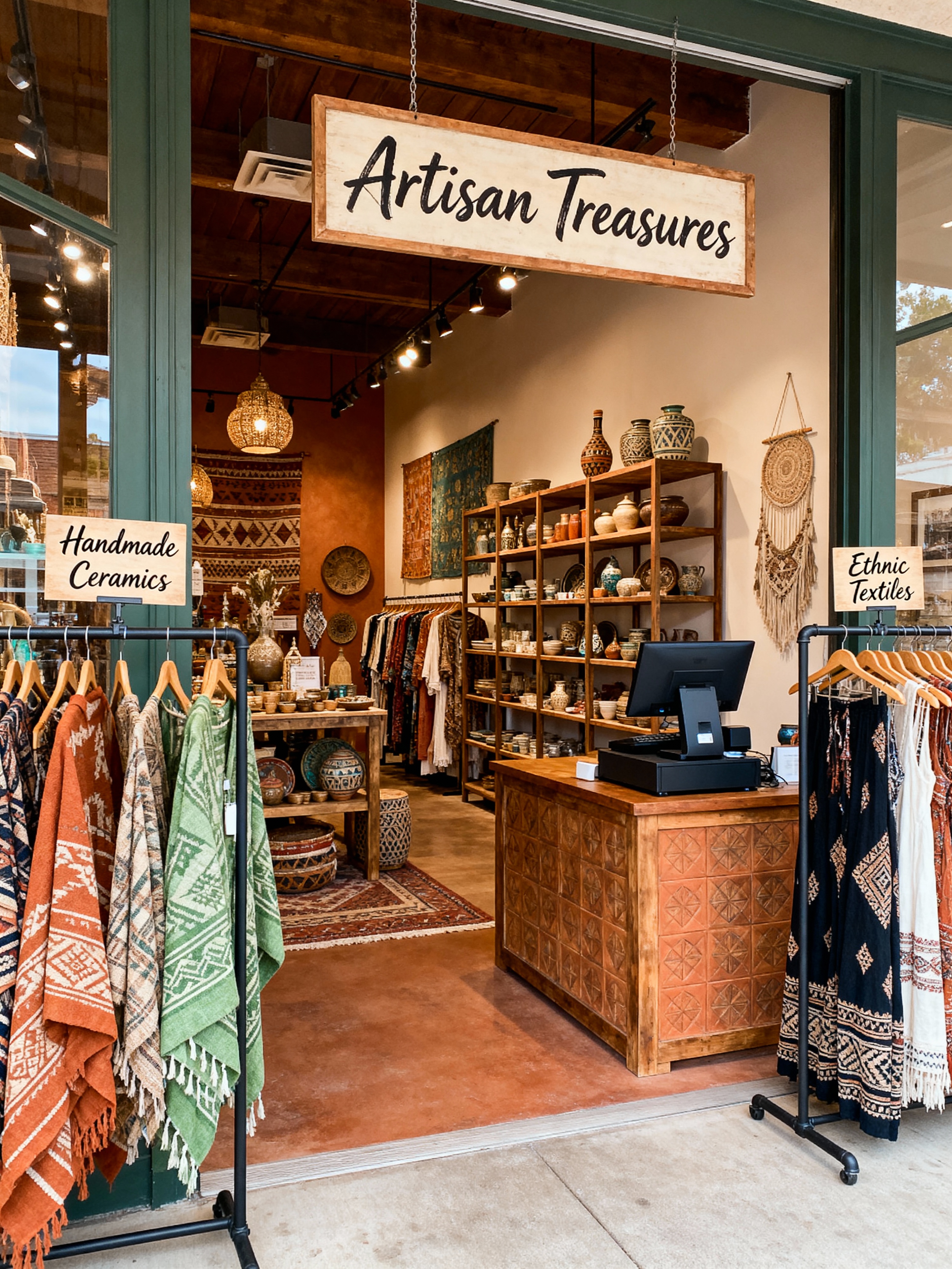 store with boho-chic style with display racks and cash register or point of sale system and signage and labels and shelving units and store fixtures and fittings and display racks. . with free-spirited and relaxed atmosphere and eclectic mix and global artifacts and bohemian flair and mixed patterns and earthy colors and layered textiles