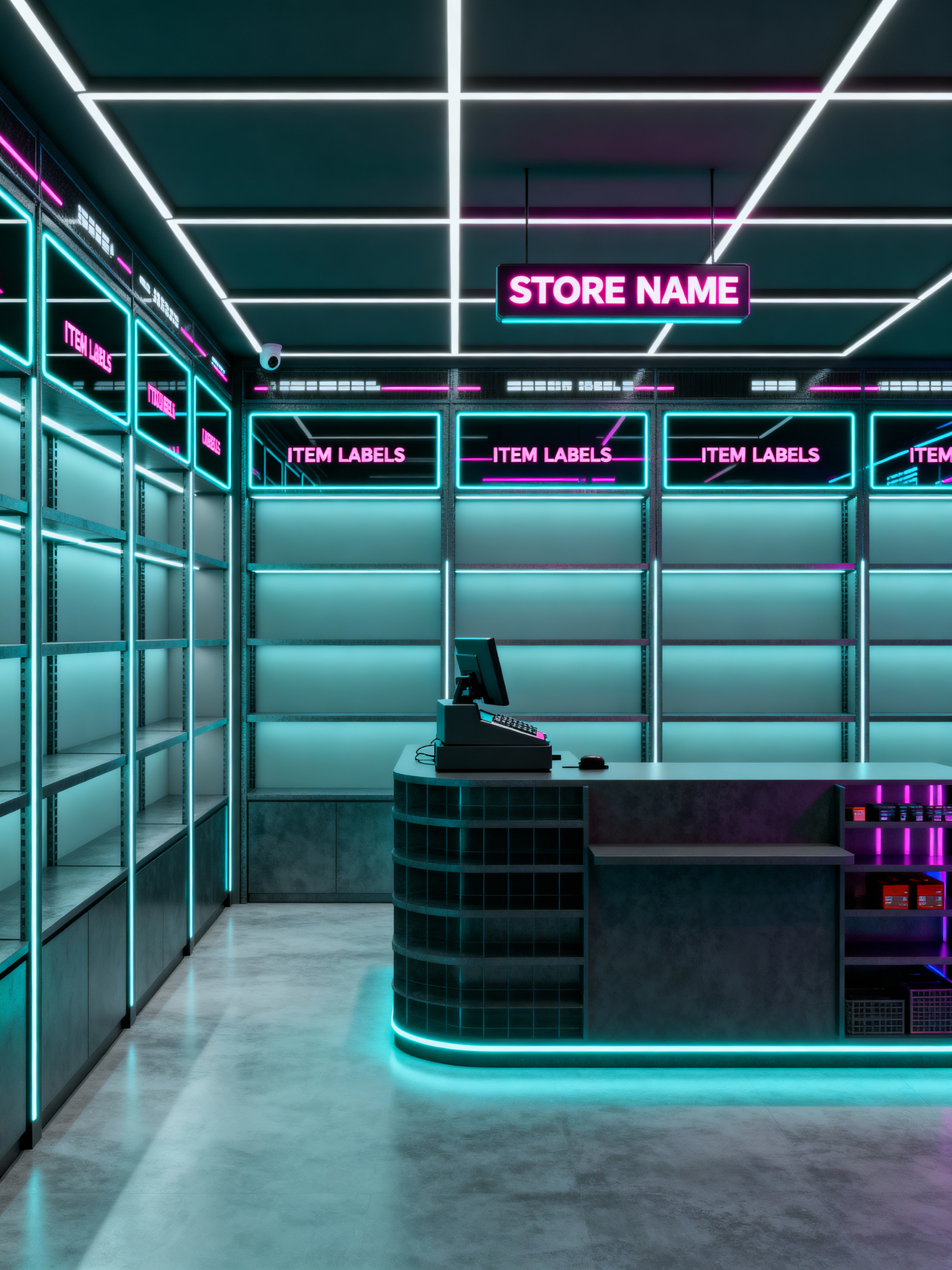 store with cyberpunk style with display racks and cash register or point of sale system and store fixtures and fittings and shelving units and signage and labels and display racks. . with minimalist and cyberpunk lights and bladerunner style and synthetic objects and cyberpunk lights and led lights and clean straight square lines and cyberpunk style