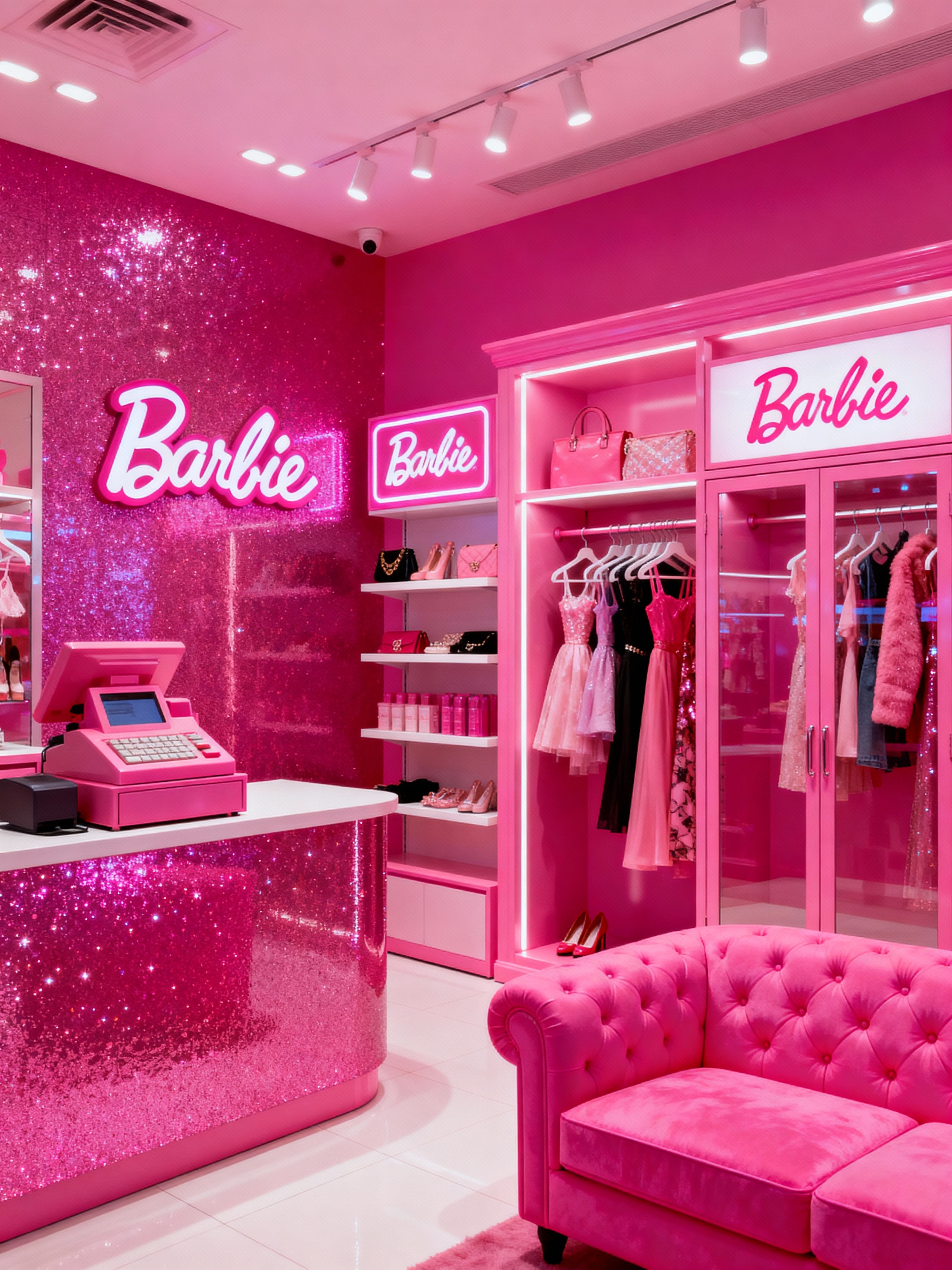 store with hot pink style with store fixtures and fittings and signage and labels and display racks and cash register or point of sale system and shelving units and store fixtures and fittings. . with hot pink barbie colors and barbie bold rosy hues like fuchsia and magenta and barbie closet and barbie style interior and barbie plastic interior and barbie sofa and hot pink barbie walls and barbie glitter and sparkle