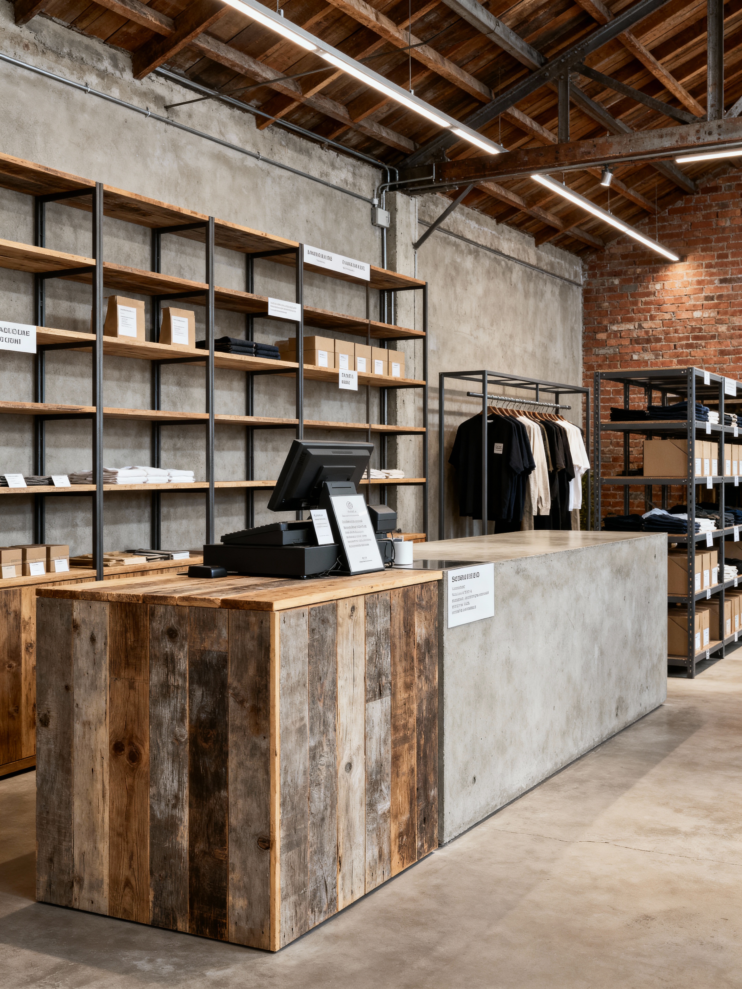 store with industrial style with shelving units and signage and labels and display racks and cash register or point of sale system and store fixtures and fittings and shelving units. . with neutral tones and reclaimed wood and exposed concrete and raw aesthetic and utilitarian objects and factory style and exposed rafters and exposed brick