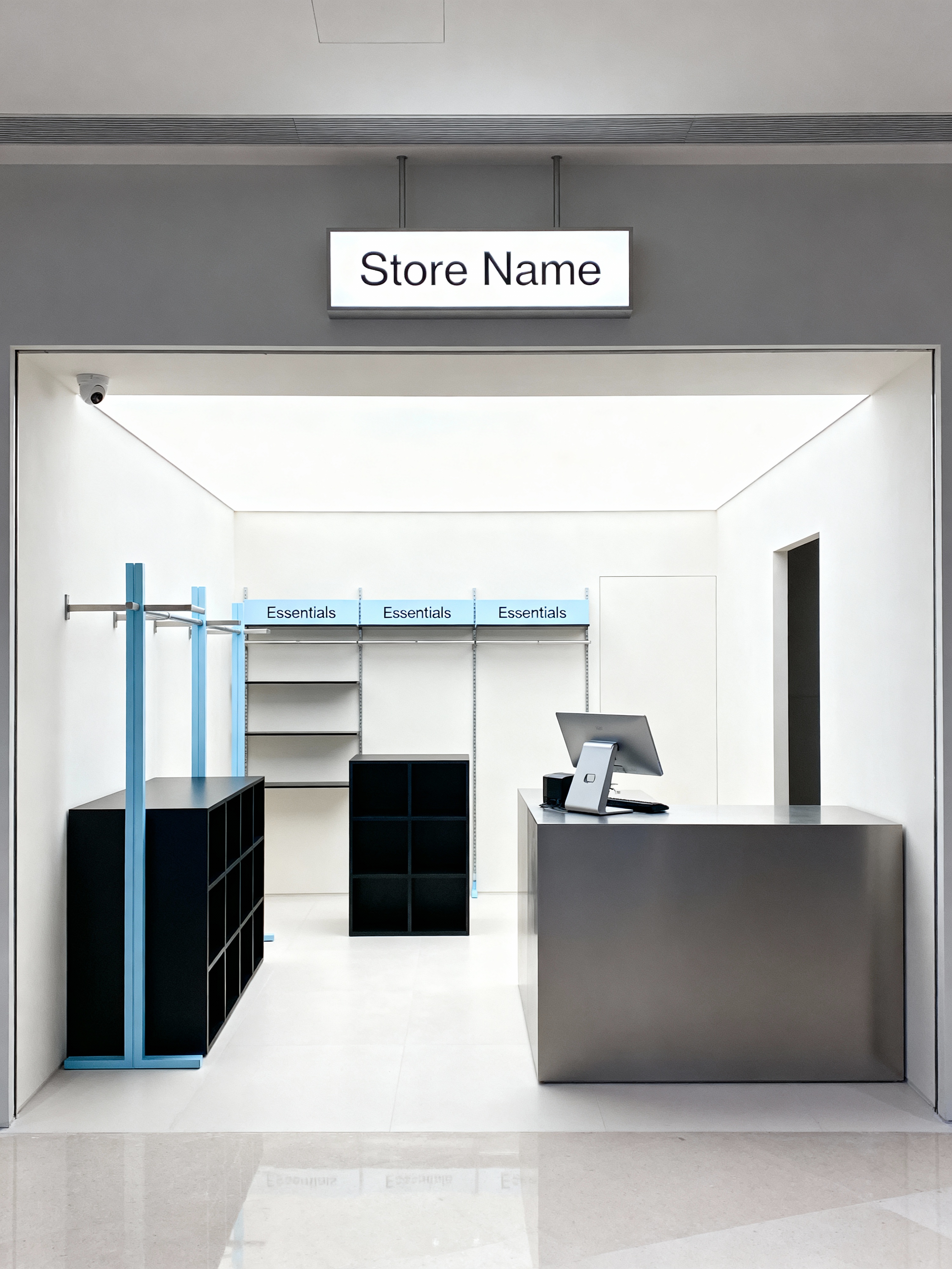 store with minimalist style with signage and labels and cash register or point of sale system and display racks and store fixtures and fittings and shelving units and signage and labels. . with an open floor plan and clean lines and lots of light and a monochromatic palette with colour used as an accent and focus on the shape, colour and texture of just a few of essential elements and functional furniture and an open floor plan