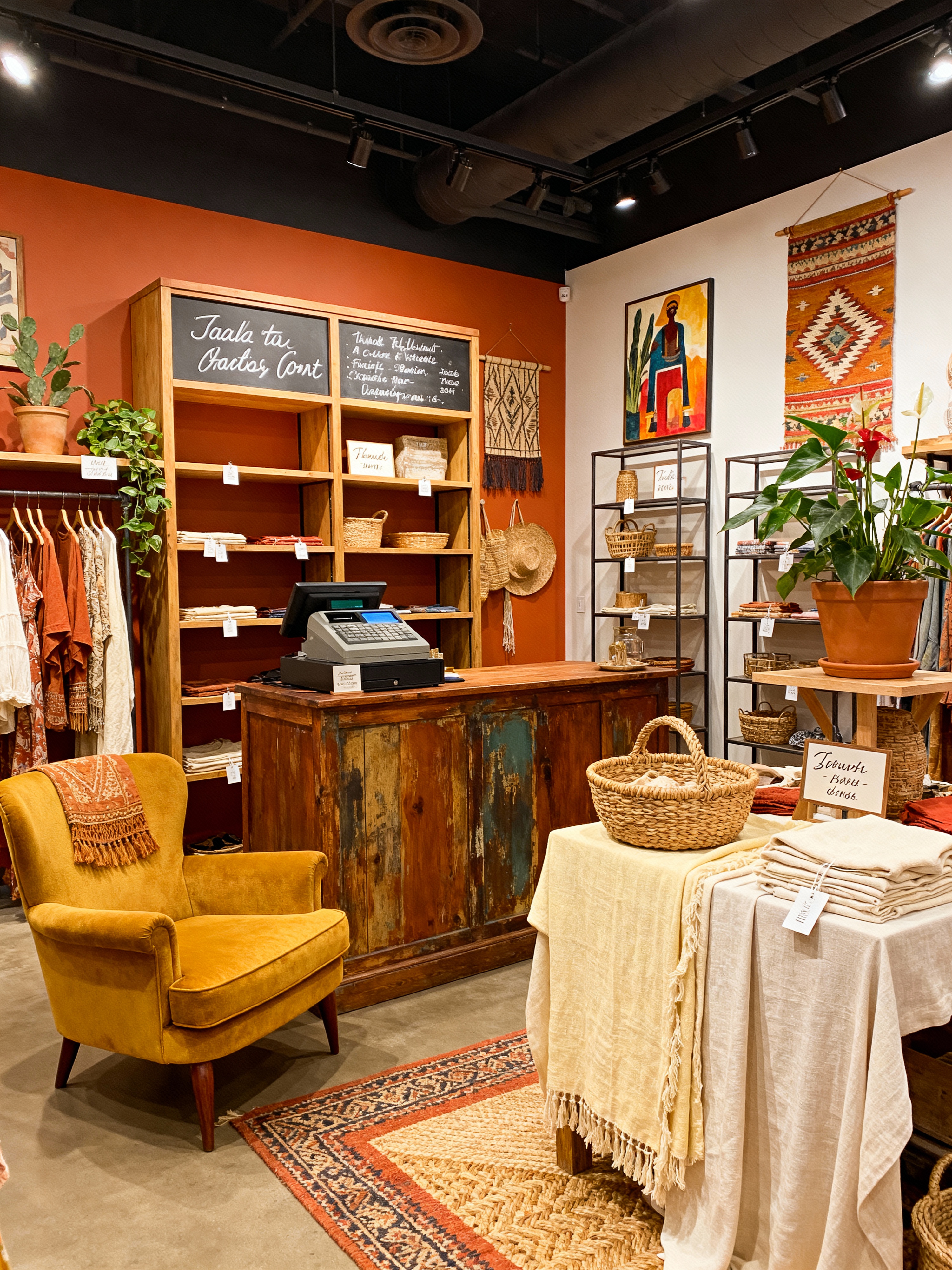 store with modern boho style with shelving units and display racks and signage and labels and cash register or point of sale system and store fixtures and fittings and shelving units. . with warm colors and layered textures and expressive decor and earthy tones and vintage furniture and linen fabric and unique finds and woven textures