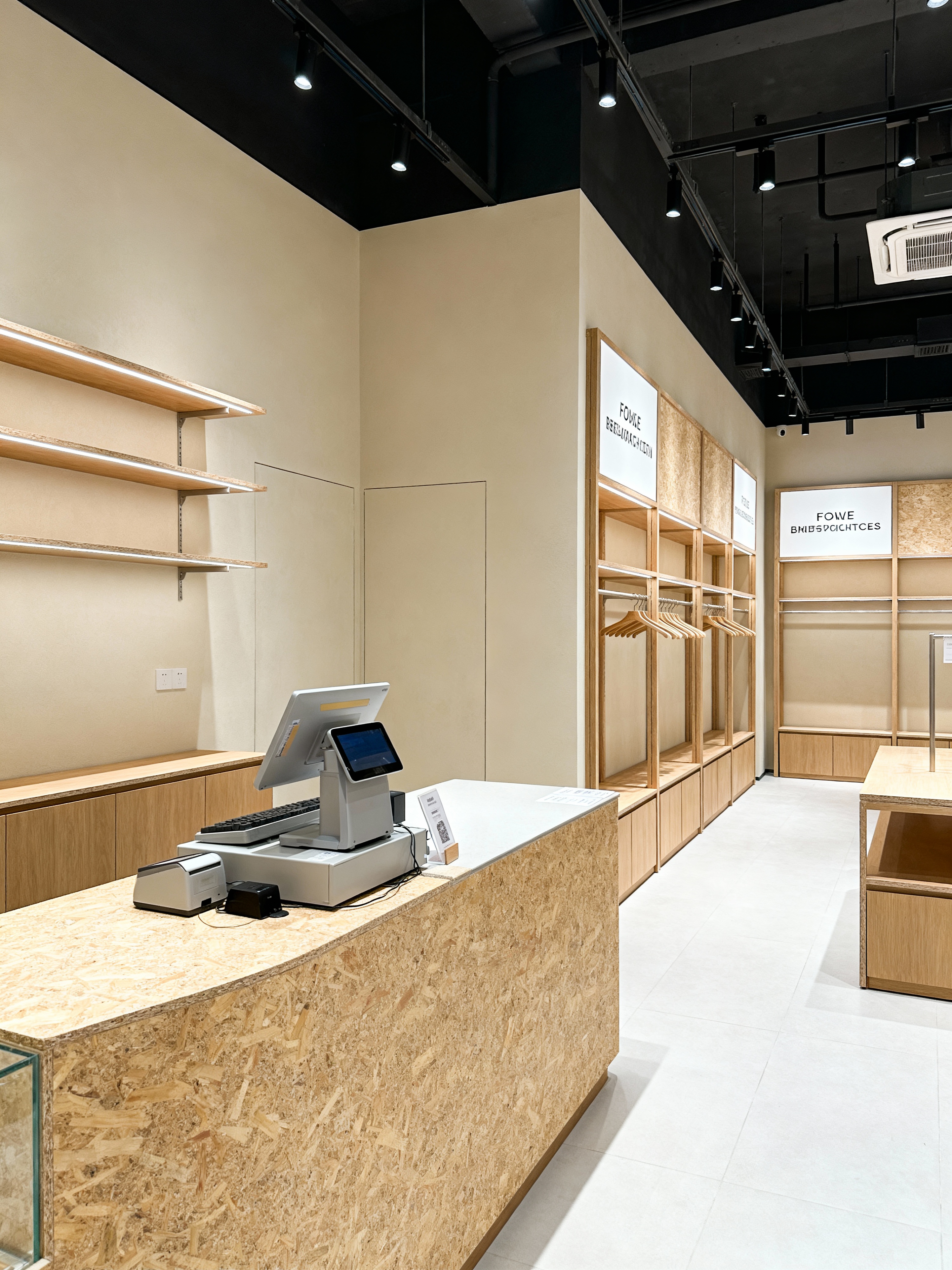 store with modern style with cash register or point of sale system and shelving units and display racks and signage and labels and store fixtures and fittings and cash register or point of sale system. . with simple, clean lines and simplistic furniture and practicality and functionality and natural materials and elements and neutral walls and textures and open and natural lighting and simple, clean lines and simplistic furniture