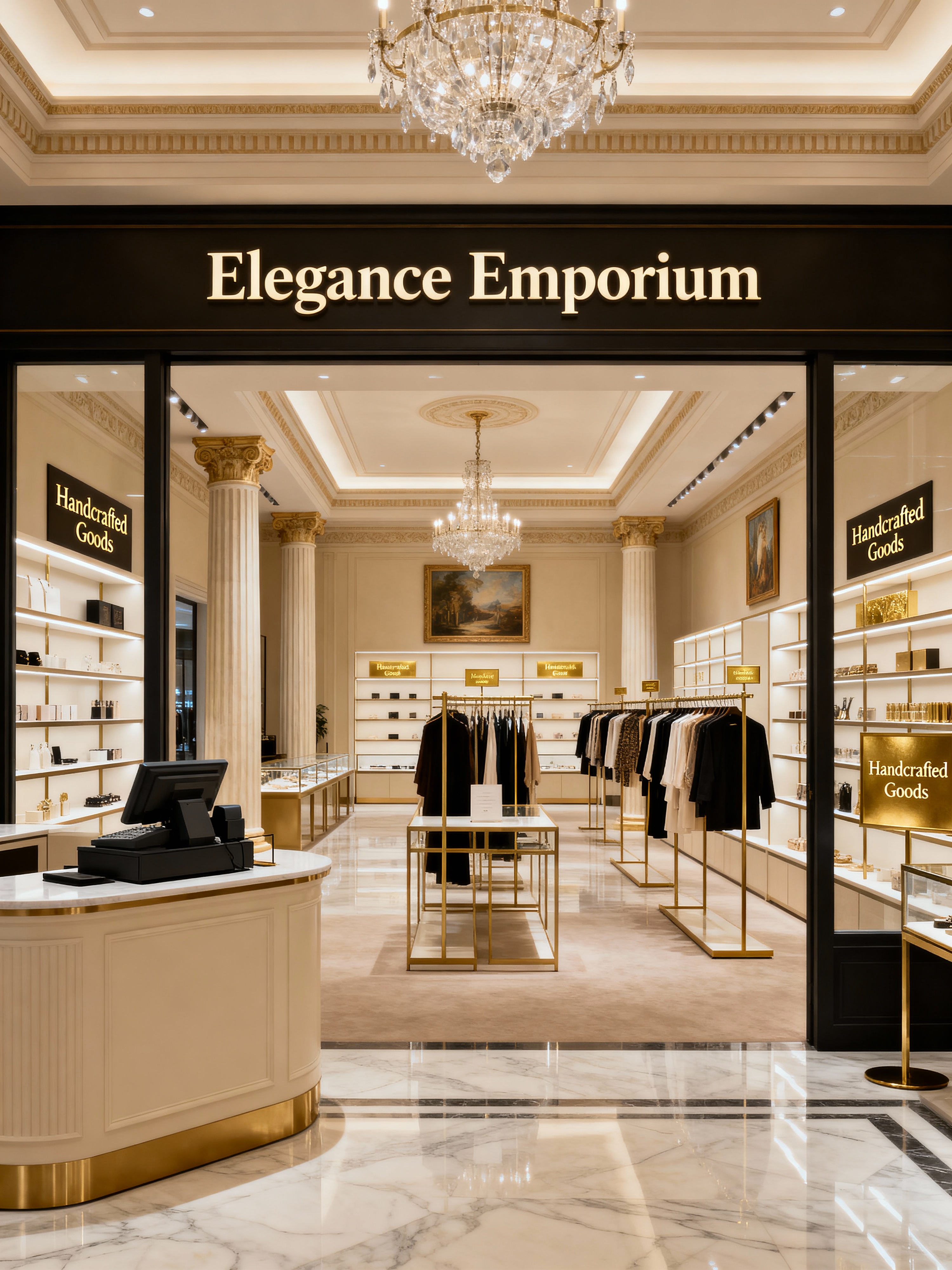 store with neoclassic style with cash register or point of sale system and display racks and store fixtures and fittings and shelving units and signage and labels and cash register or point of sale system. . with timeless artwork and spacious rooms and emphasized horizontal and vertical lines and geometric decorative elements and thoughtful minimalism and symmetric layouts and greek columns and high ceilings