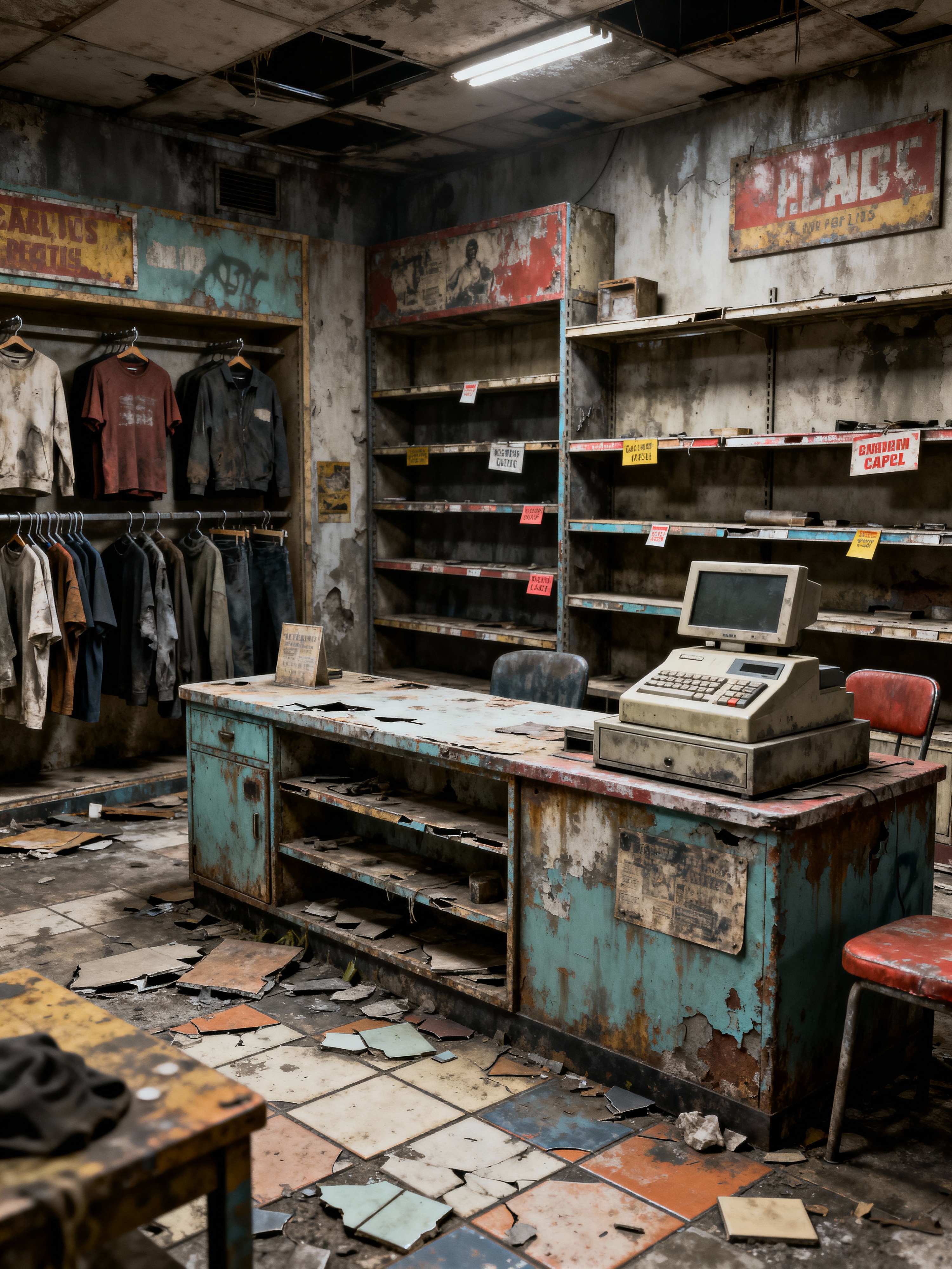 store with post-apocalyptic style with cash register or point of sale system and display racks and store fixtures and fittings and signage and labels and shelving units and cash register or point of sale system. . with weathered materials and makeshift furniture and desolate and distressed furniture and broken tiles and gritty atmosphere and abandoned look and cheap mismatched furniture