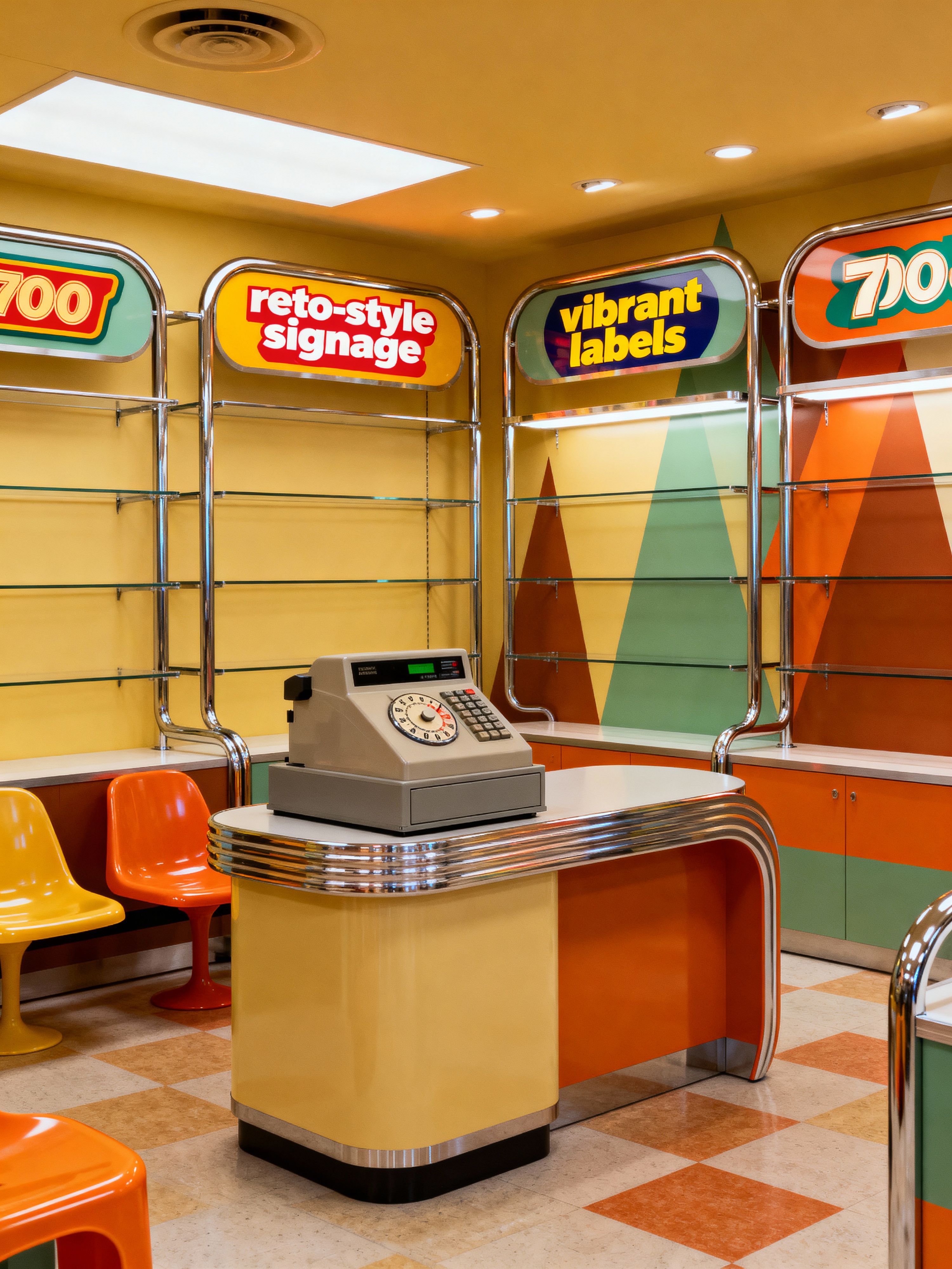 store with retro style with store fixtures and fittings and display racks and cash register or point of sale system and signage and labels and shelving units and store fixtures and fittings. . with groovy vibes and chrome accents and space age and mod style and funky decor and nostalgic pieces and plastic furniture and bold patterns