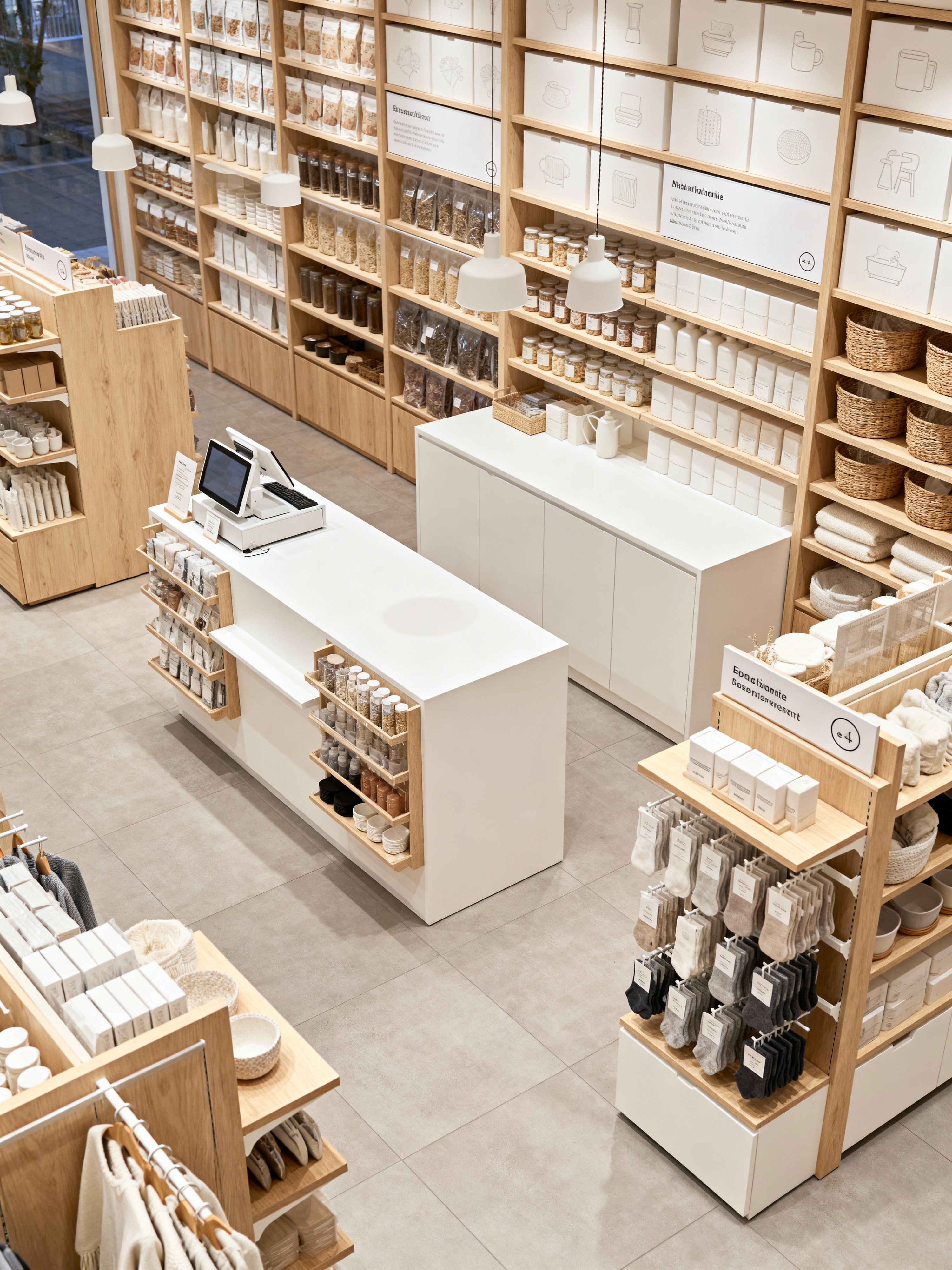store with scandinavian style with shelving units and signage and labels and cash register or point of sale system and display racks and store fixtures and fittings and shelving units. . with natural light and neutral palette and light wood and hygge and minimalist design and functional furniture and white decor and cozy atmosphere