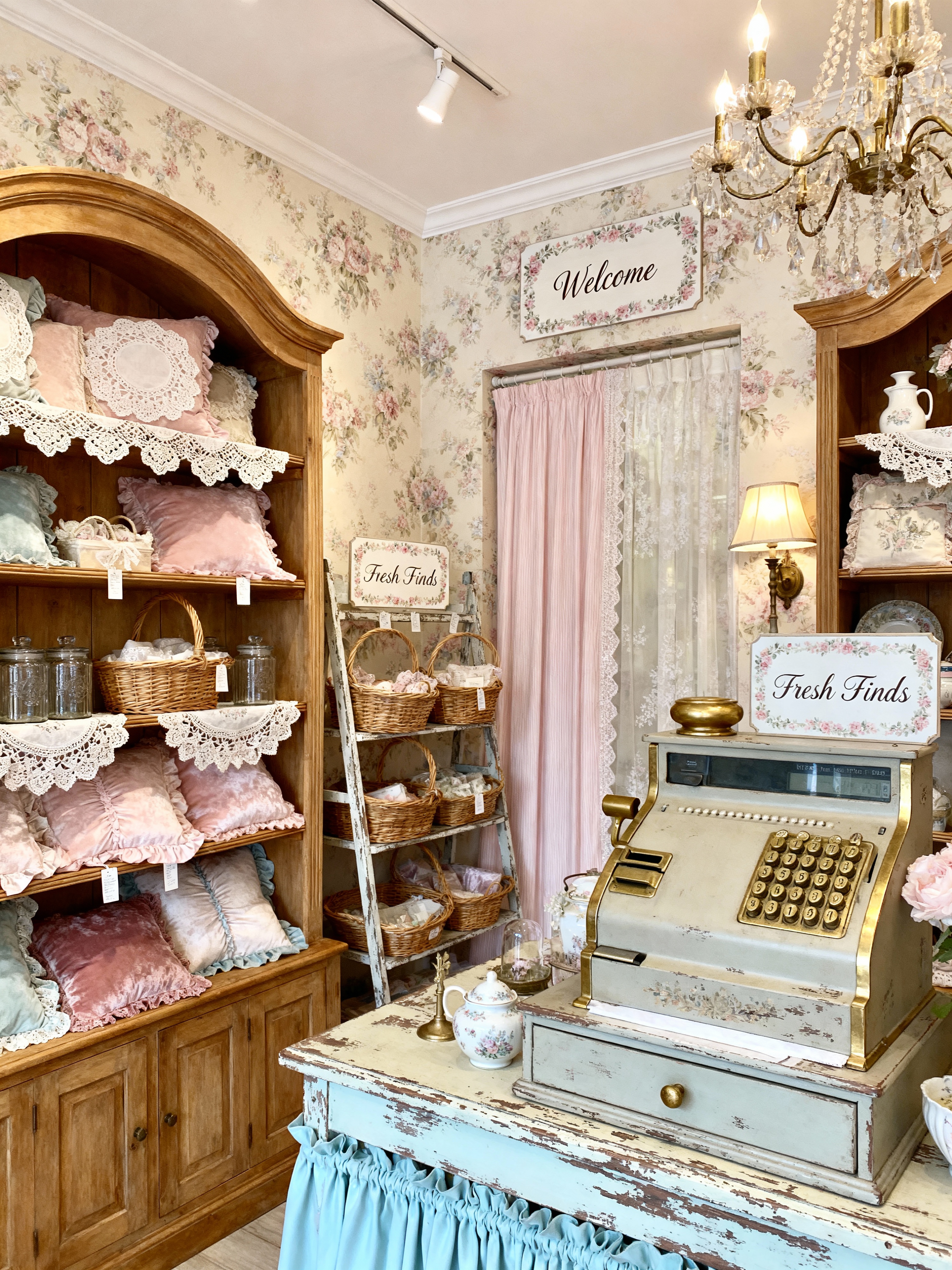 store with shabby chic style with store fixtures and fittings and shelving units and cash register or point of sale system and display racks and signage and labels and store fixtures and fittings. . with floral patterns and vintage charm and romantic style and cottage feel and soft textures and delicate details and distressed furniture and antique lace
