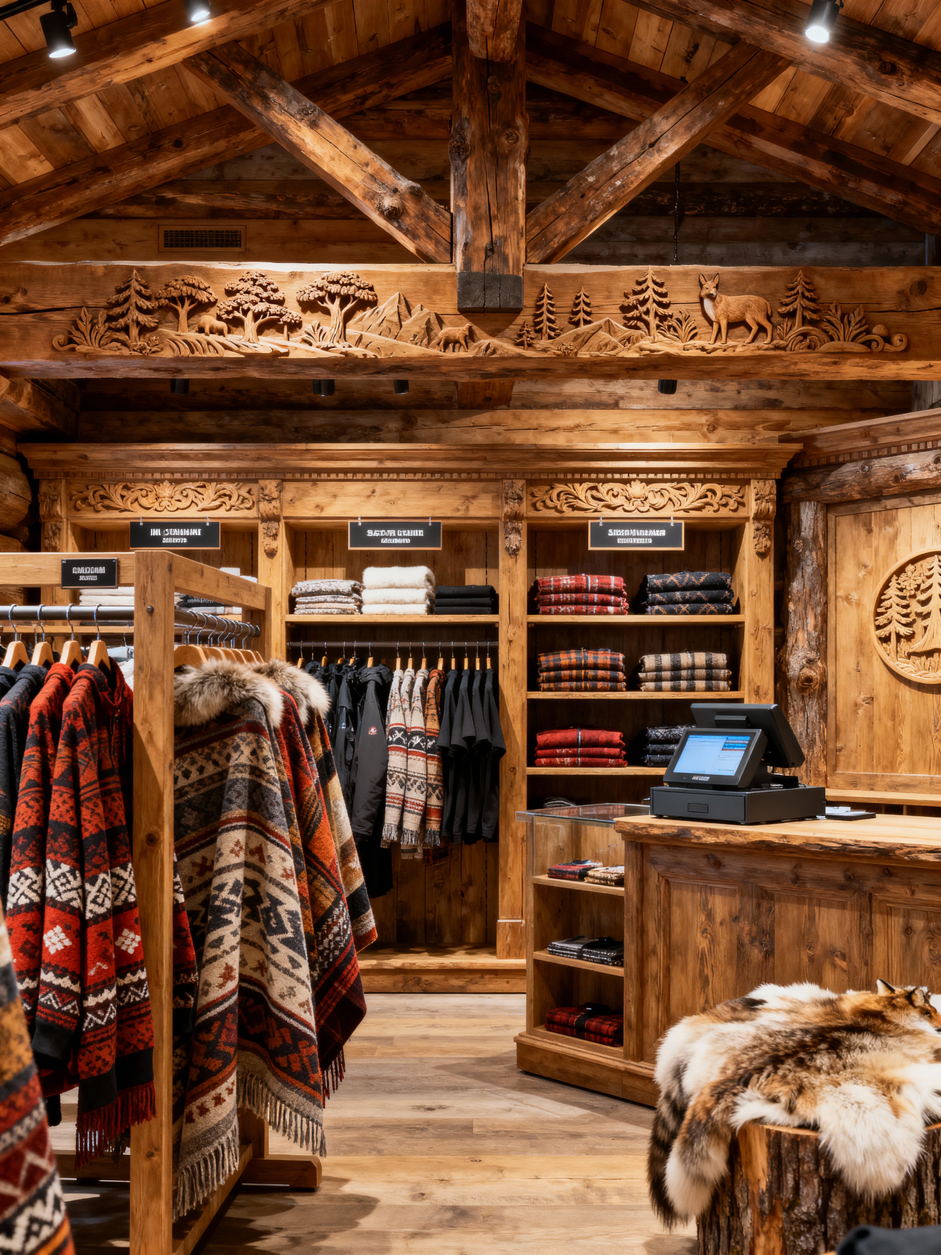 store with ski chalet style with signage and labels and display racks and store fixtures and fittings and shelving units and cash register or point of sale system and signage and labels. . with richly patterned fabrics and exposed timber and wood beams and animal furs and exposed construction beams and nature-inspired and decorative carving and mouldings and layered textiles