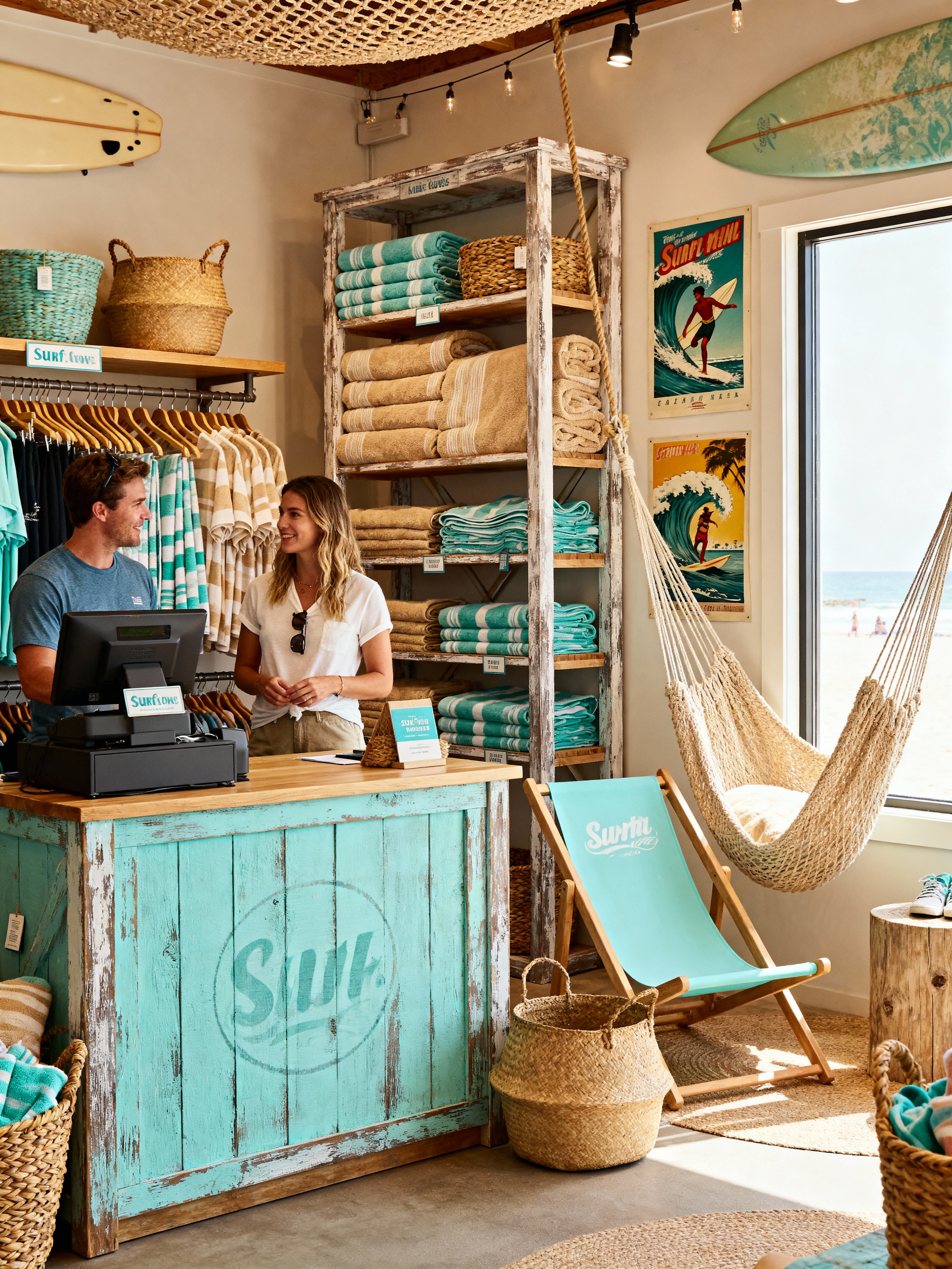 store with surf shack style with signage and labels and display racks and store fixtures and fittings and shelving units and cash register or point of sale system and signage and labels. . with beach chairs and woven baskets and beach towels and hammocks and turquoise accents and weathered wood and vintage surf posters and sand-colored textiles