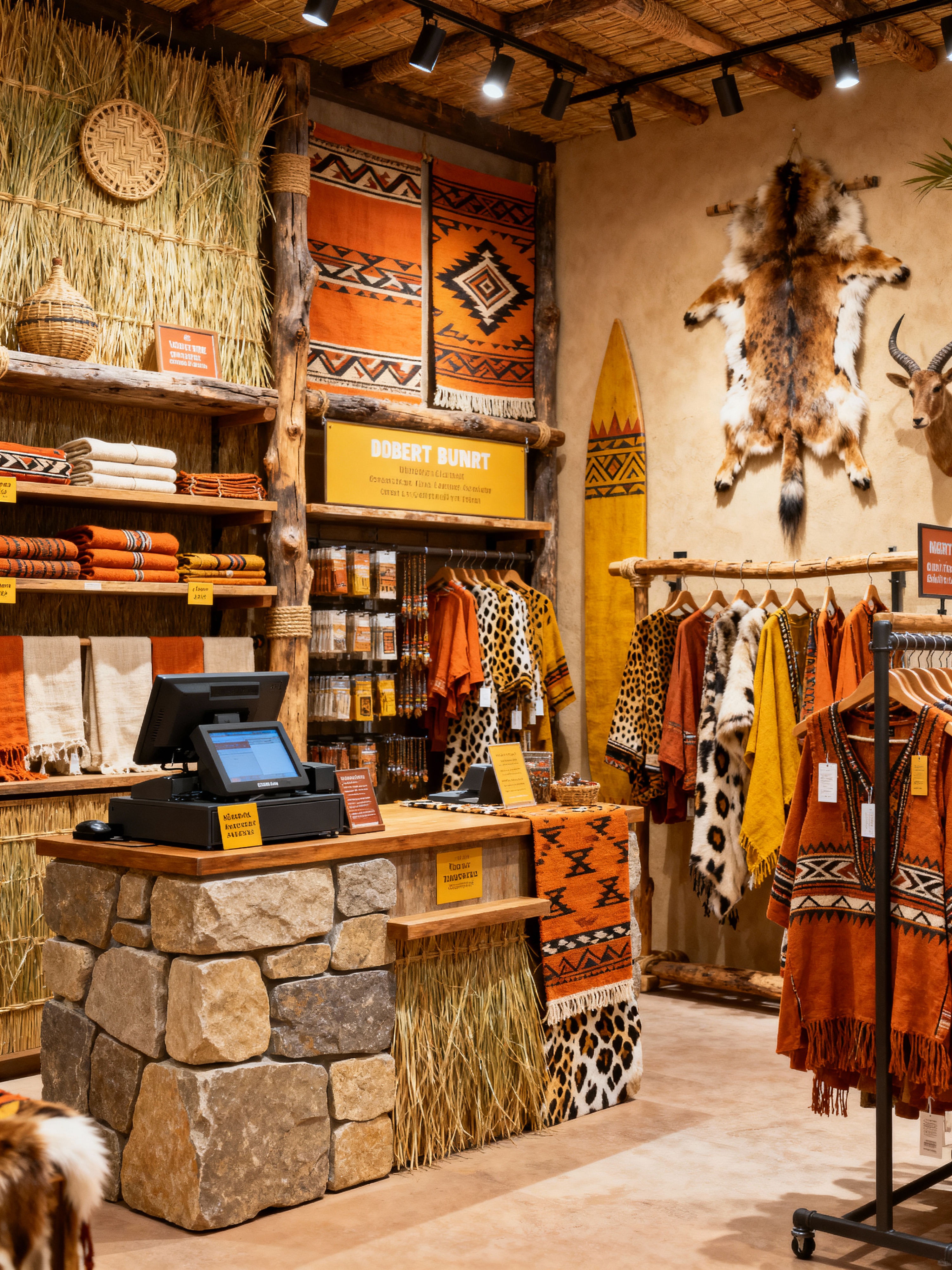 store with tribal style with cash register or point of sale system and shelving units and signage and labels and display racks and store fixtures and fittings and cash register or point of sale system. . with intricate grass weaving and animal furslinen and planks of stone and animal prints and smooth worn timbers and tribal patterns and exuberant splashes of colour and desert colours