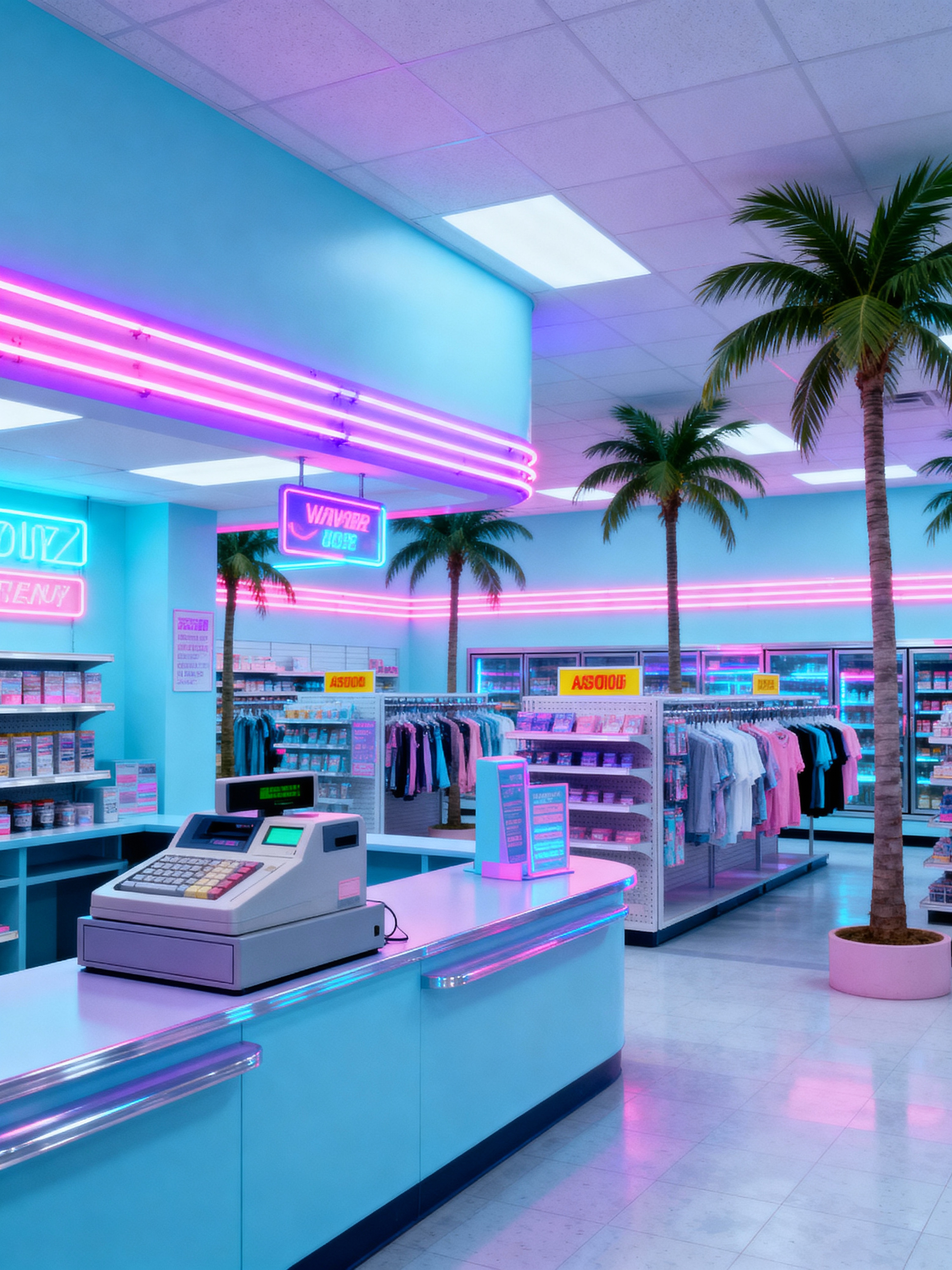 store with vaporwave style with store fixtures and fittings and cash register or point of sale system and display racks and signage and labels and shelving units and store fixtures and fittings. . with 1980s retail shops and palm trees and baby blue and washed out colors and bright pink and purple lights and palm trees and palm trees