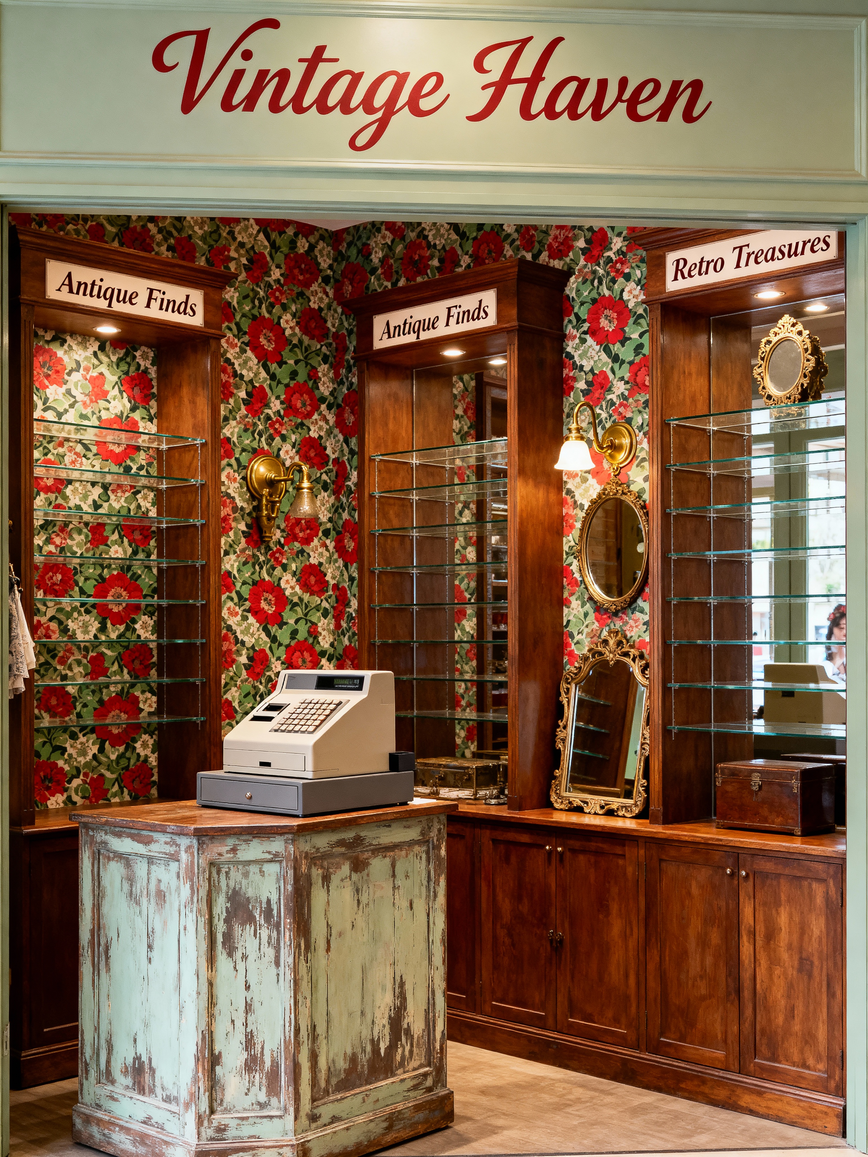 store with vintage style with shelving units and cash register or point of sale system and signage and labels and store fixtures and fittings and display racks and shelving units. . with bold patterns and timeless pieces and antique decor and shabby chic and retro style and mid-century and nostalgic feel and ornate details