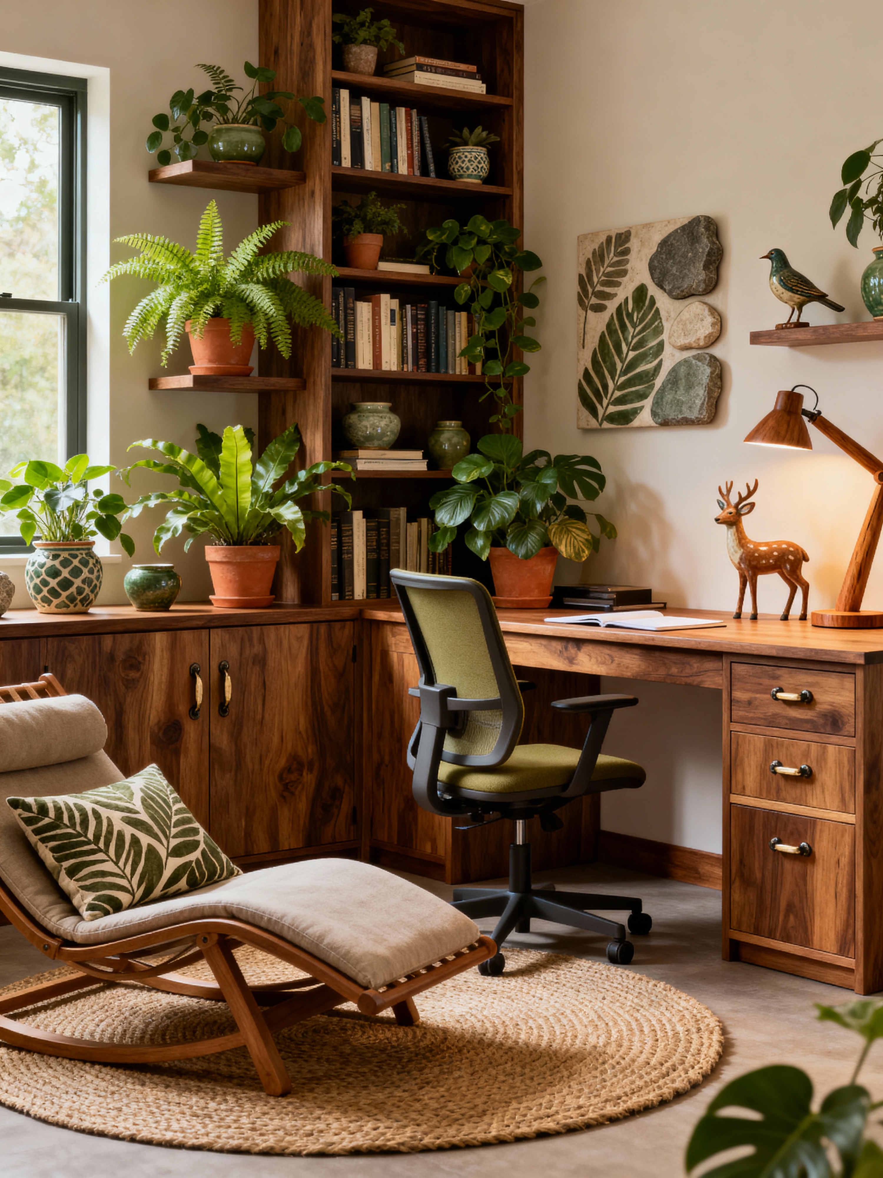 study room with biophilic style with office chair and cabinets and plant and writing desk and desk lamp and bookshelves and lounge chair and office chair. . with plants and natural elements and plants and natural patterns and ceramic materials and images of animals and features of nature and earthy colors