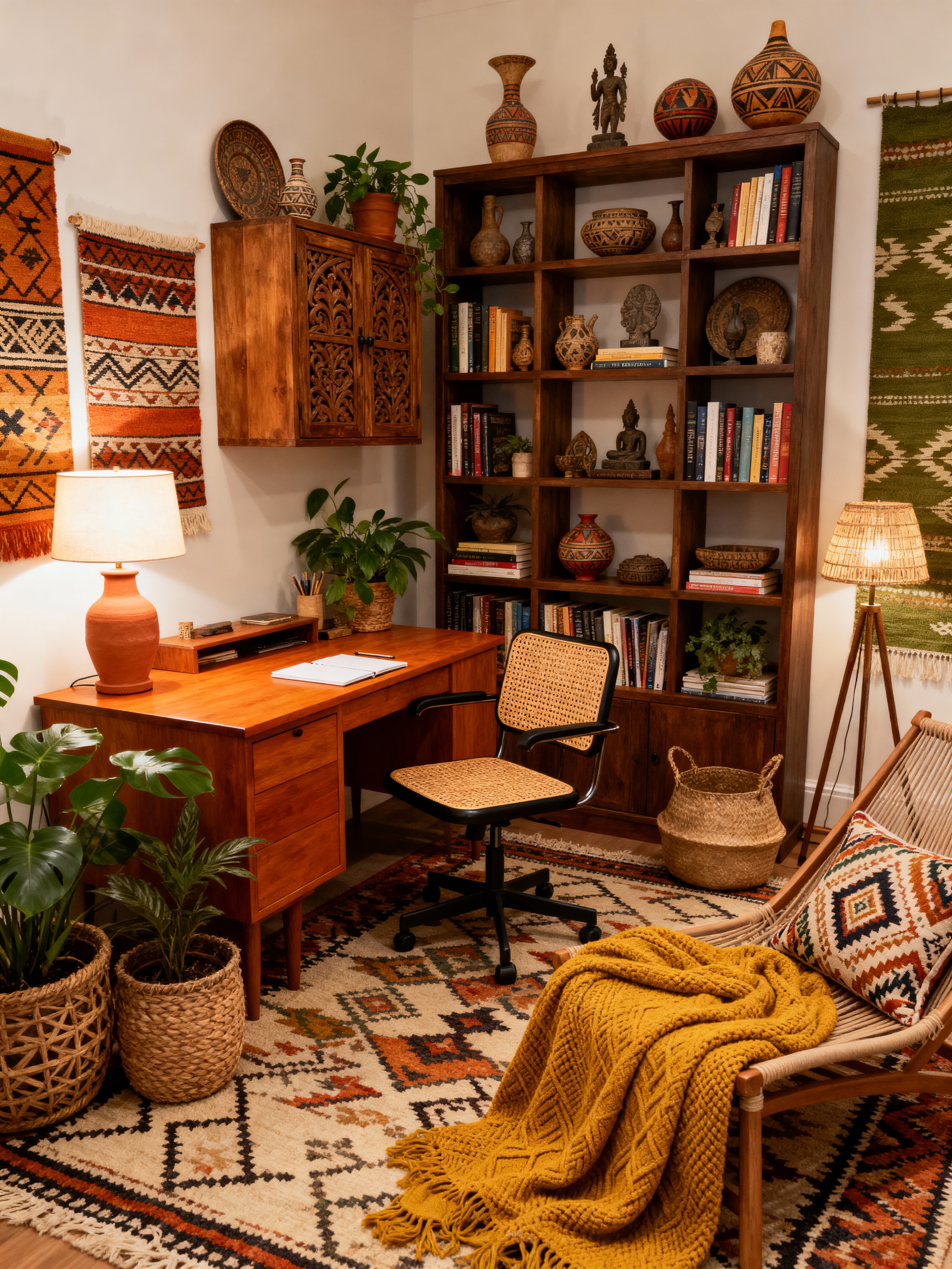 study room with boho-chic style with bookshelves and plant and desk lamp and writing desk and cabinets and office chair and lounge chair and bookshelves. . with mixed patterns and free-spirited and relaxed atmosphere and bohemian flair and natural materials and global artifacts and earthy colors and layered textiles