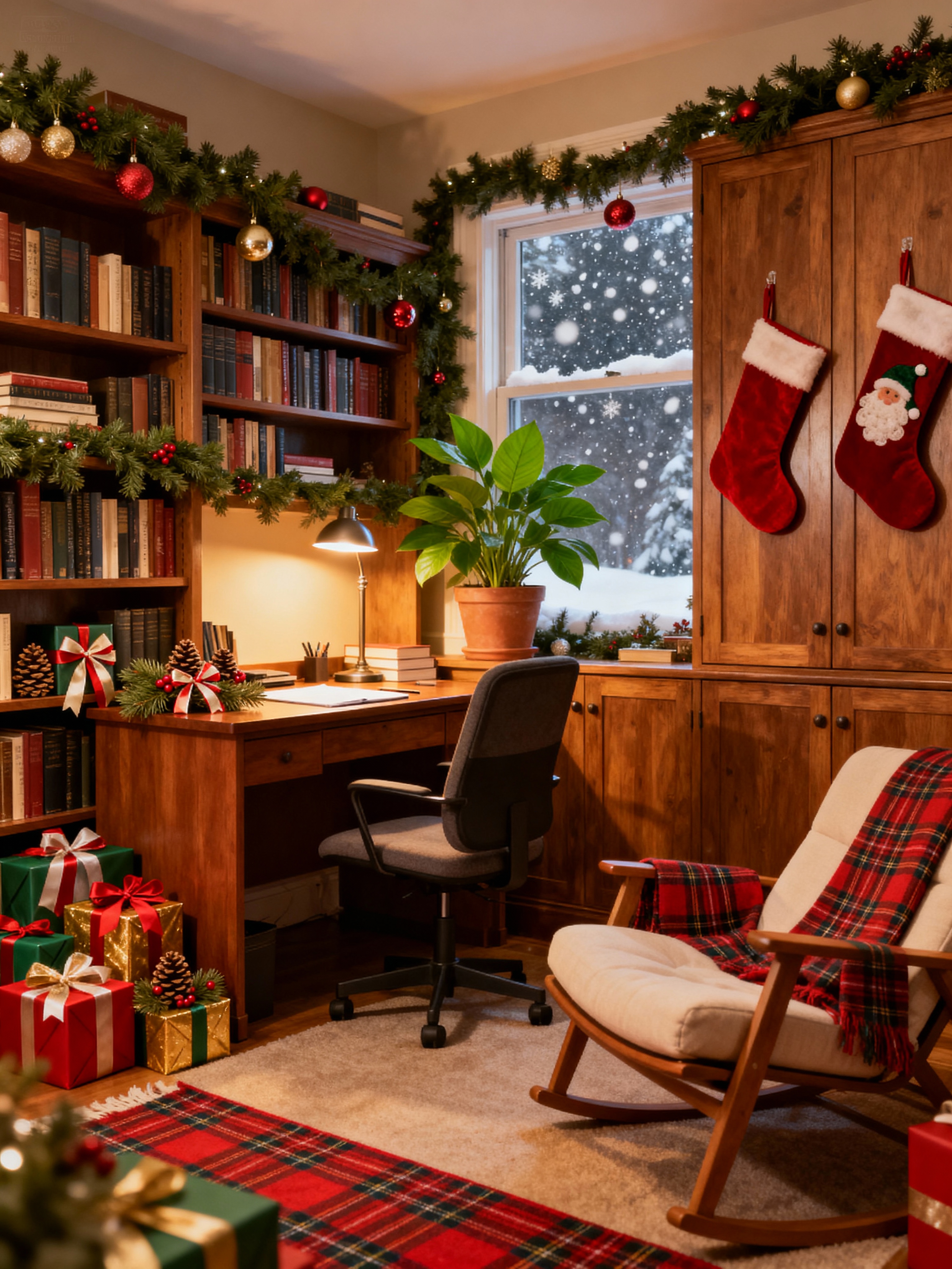 study room with christmas style with bookshelves and cabinets and plant and writing desk and lounge chair and desk lamp and office chair and bookshelves. . with giftwrapped gifts and ribbons and tie pinecones and berries and berries and greenery draped and christmas ornaments and snow outside and a few big socks hanging and plaid rugs