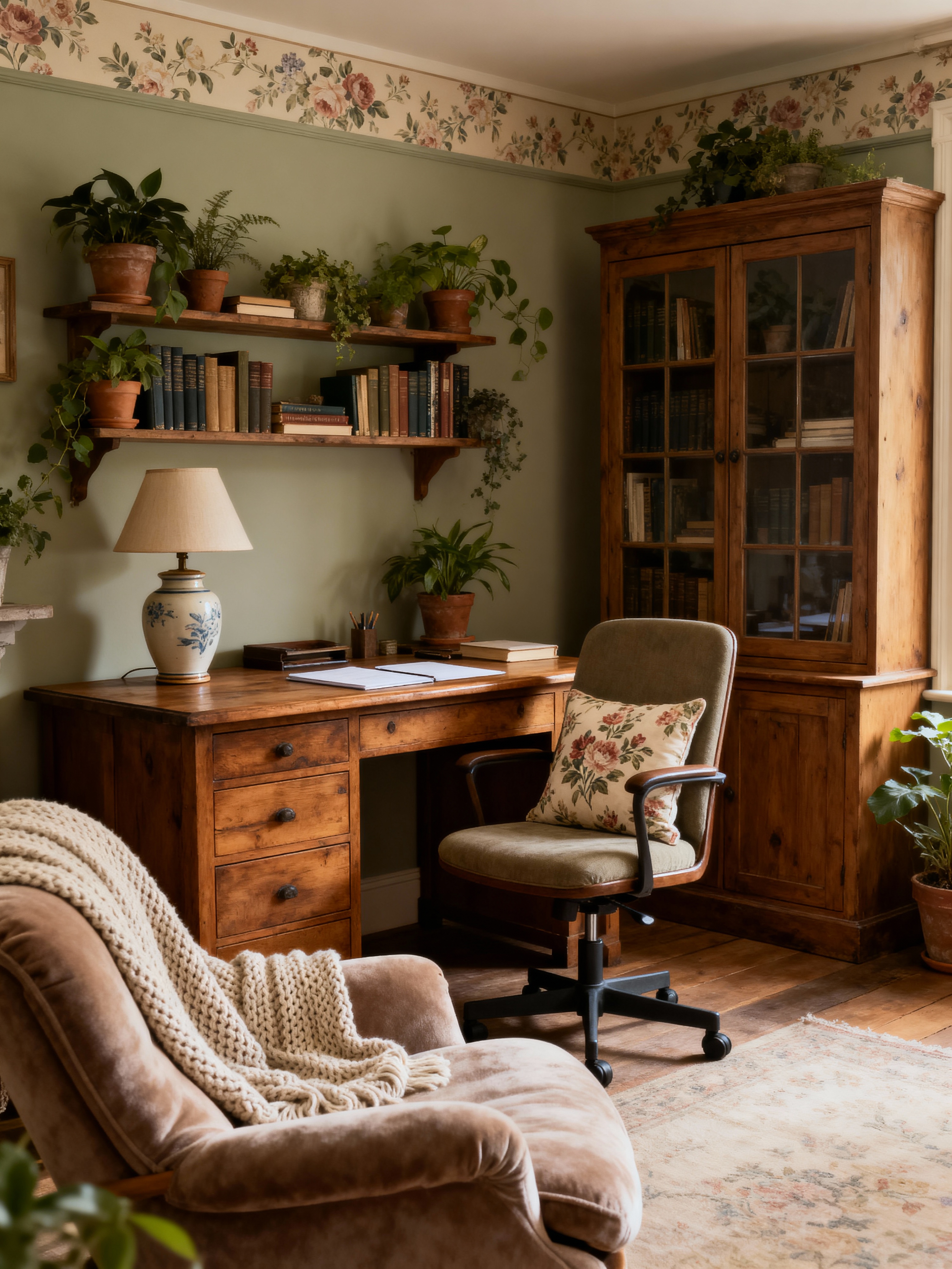 study room with cottagecore style with writing desk and plant and cabinets and office chair and lounge chair and desk lamp and bookshelves and writing desk. . with muted colors and rustic and organic and traditional and natural and cottage style and floral patterns and earthy