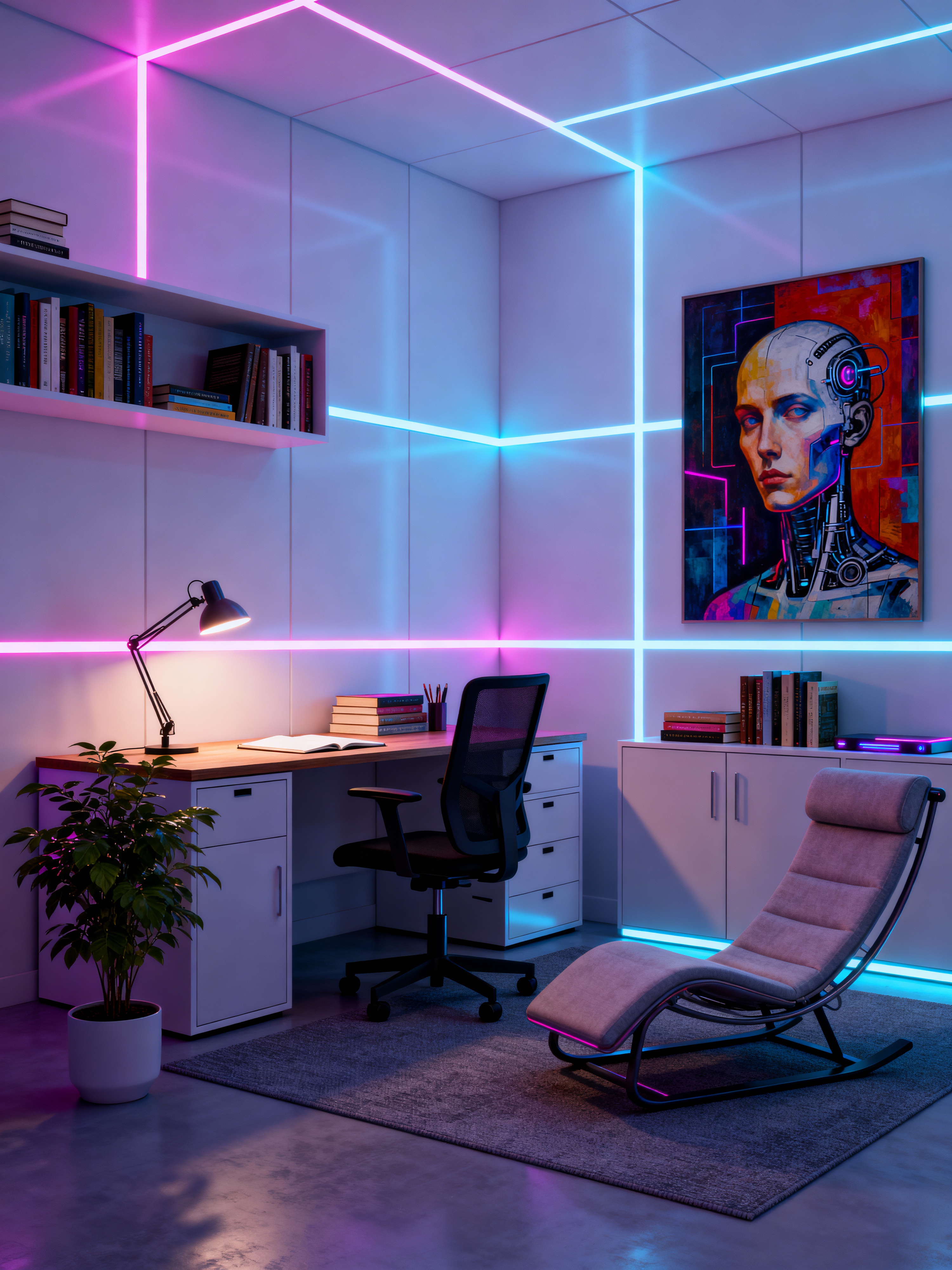 study room with cyberpunk style with desk lamp and writing desk and bookshelves and plant and cabinets and office chair and lounge chair and desk lamp. . with cyberpunk lights and clean straight square lines and minimalist and futuristic cybernetic details and cyberpunk style and strong geometric walls and surrealist paintings and color lights glow