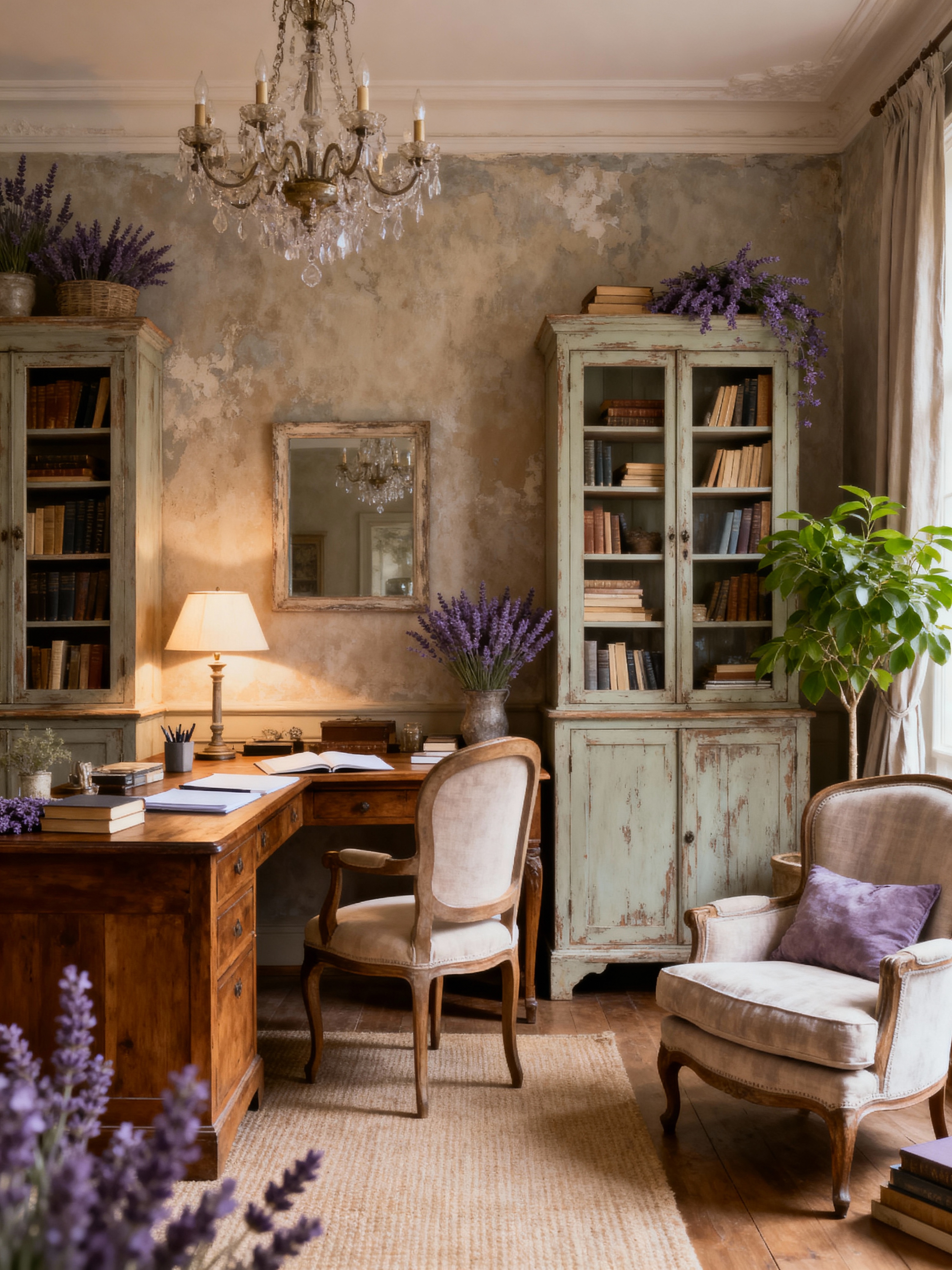 study room with french country style with bookshelves and cabinets and writing desk and desk lamp and office chair and lounge chair and plant and bookshelves. . with textured walls and elegant rustic and soft fabrics and vintage furniture and chandeliers and lavender accents and warm tones and distressed wood