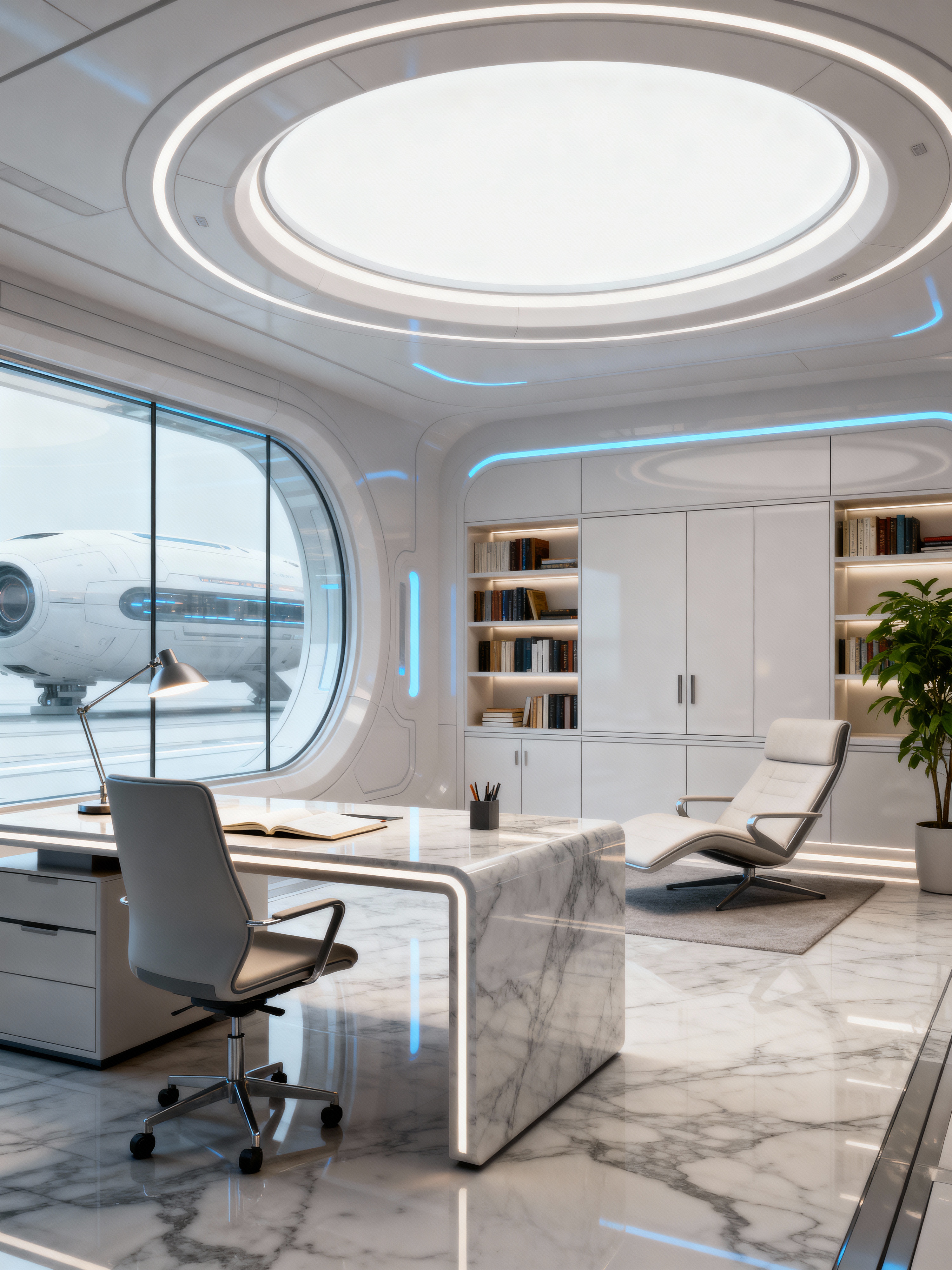 study room with futuristic style with office chair and plant and desk lamp and lounge chair and cabinets and bookshelves and writing desk and office chair. . with smooth polished marble and smooth marble and futurism minimalist interior and spaceship interior and glass panes and futurism and neutral background and bright accents and circular shapes