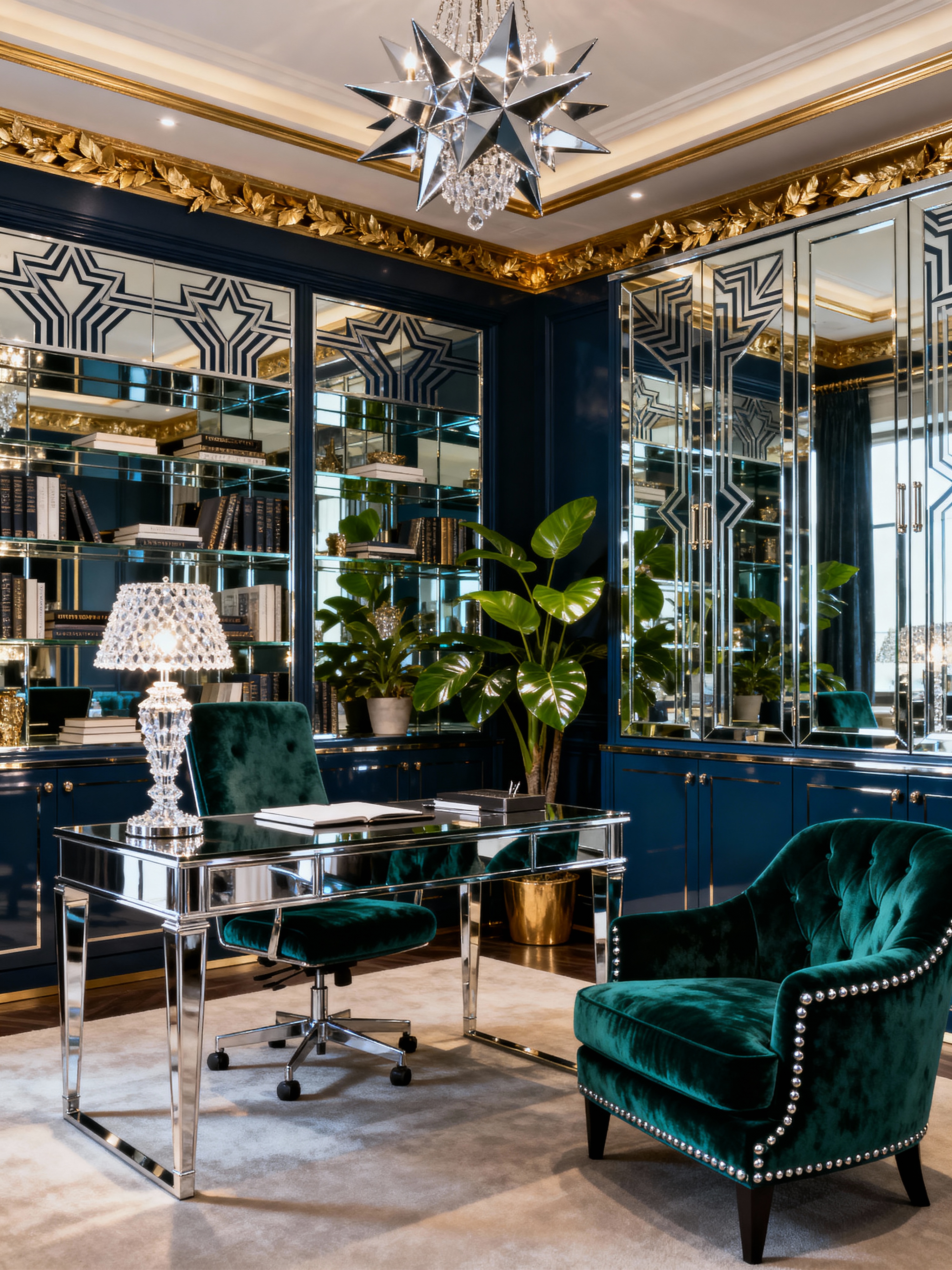 study room with hollywood glam style with plant and cabinets and writing desk and lounge chair and bookshelves and desk lamp and office chair and plant. . with glamorous style and star quality and dramatic lighting and mirrored surfaces and velvet upholstery and opulent details and art deco influence and metallic accents