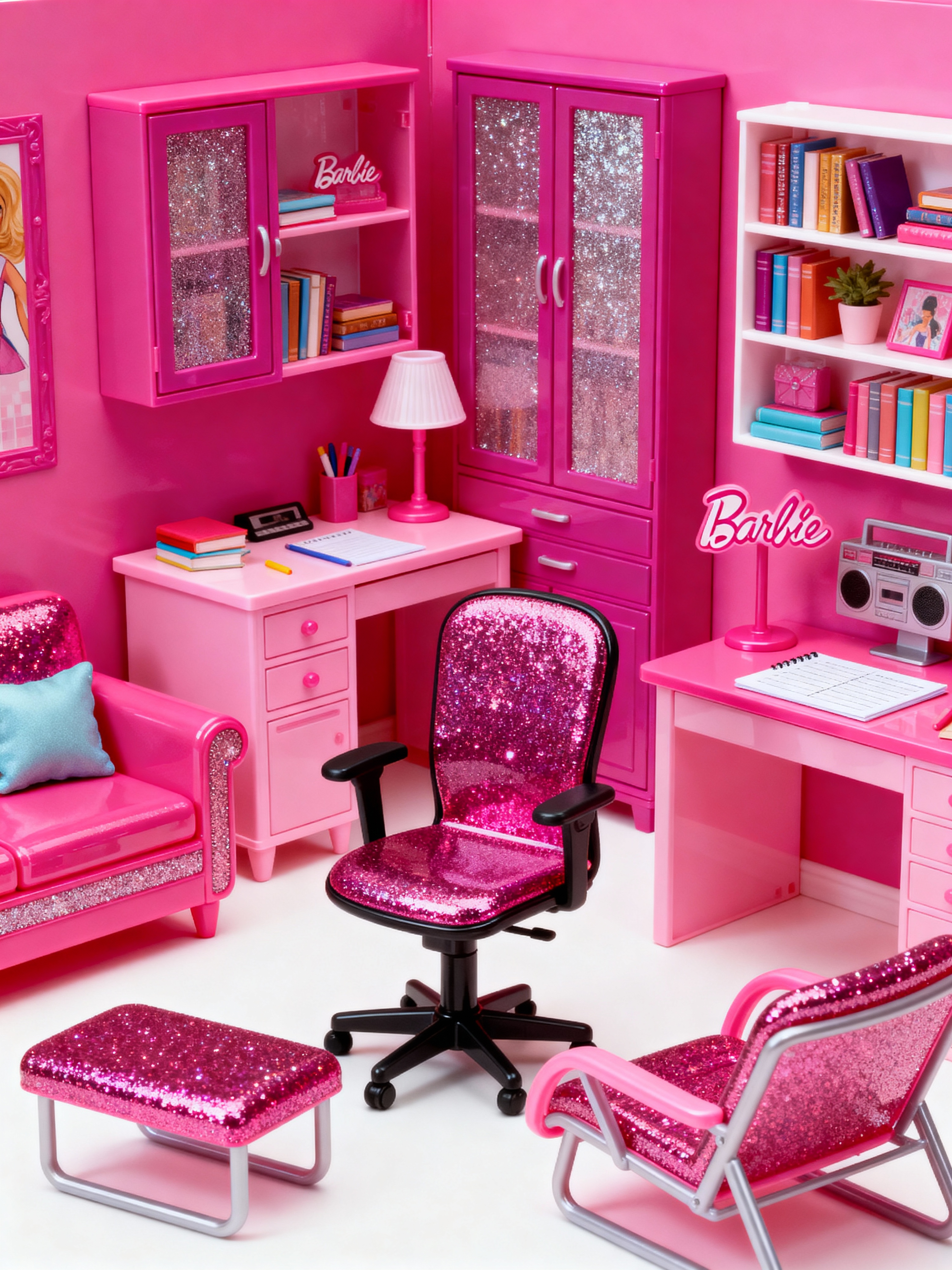 study room with hot pink style with writing desk and cabinets and plant and office chair and lounge chair and desk lamp and bookshelves and writing desk. . with hot pink barbie colors and barbie style interior and barbie plastic interior and barbie bold rosy hues like fuchsia and magenta and hot pink barbie walls and barbie sofa and barbie glitter and sparkle and barbie chairs