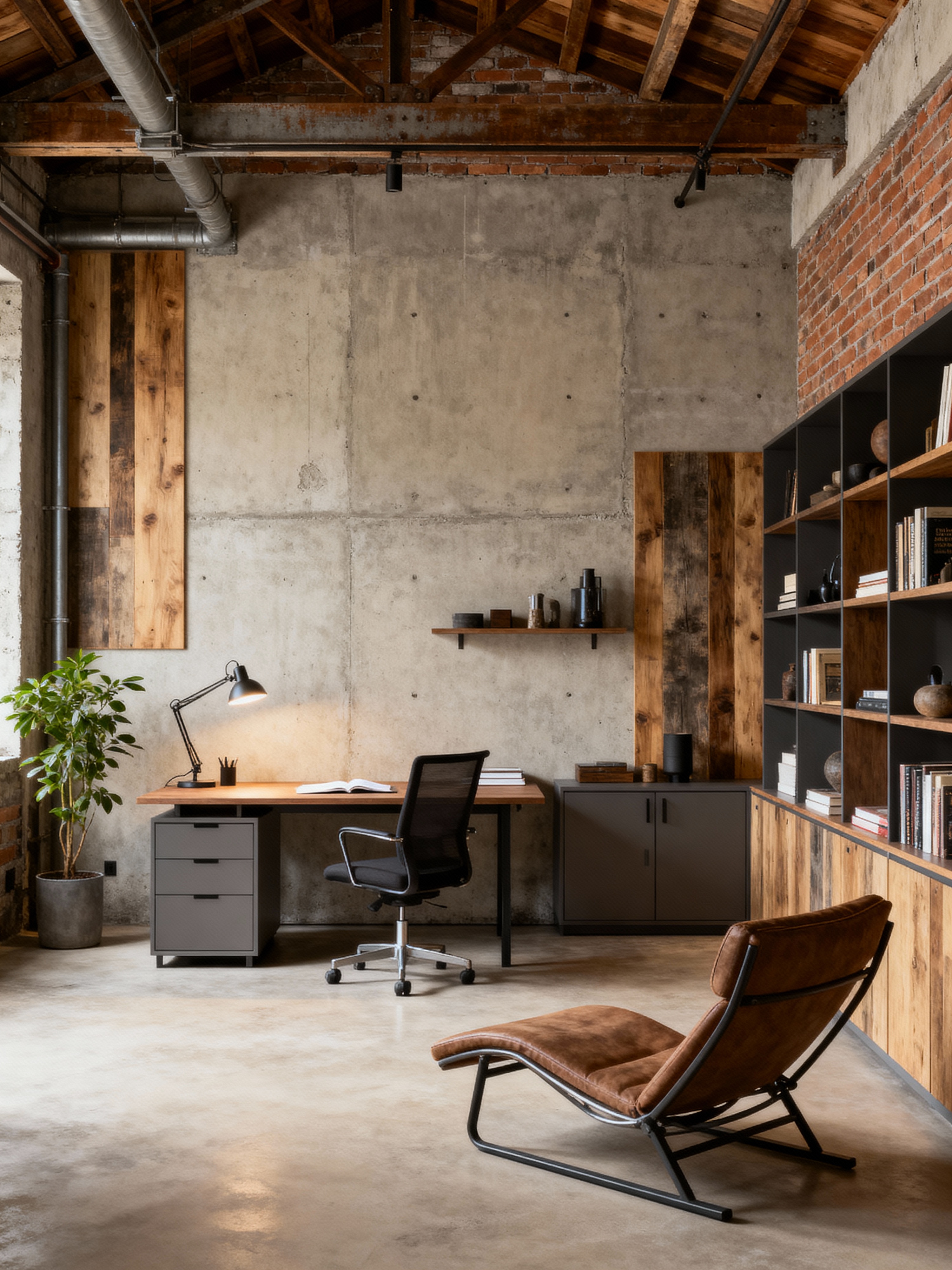 study room with industrial style with cabinets and office chair and lounge chair and writing desk and bookshelves and plant and desk lamp and cabinets. . with exposed concrete and reclaimed wood and exposed brick and utilitarian objects and exposed rafters and raw aesthetic and open floorplan and neutral tones