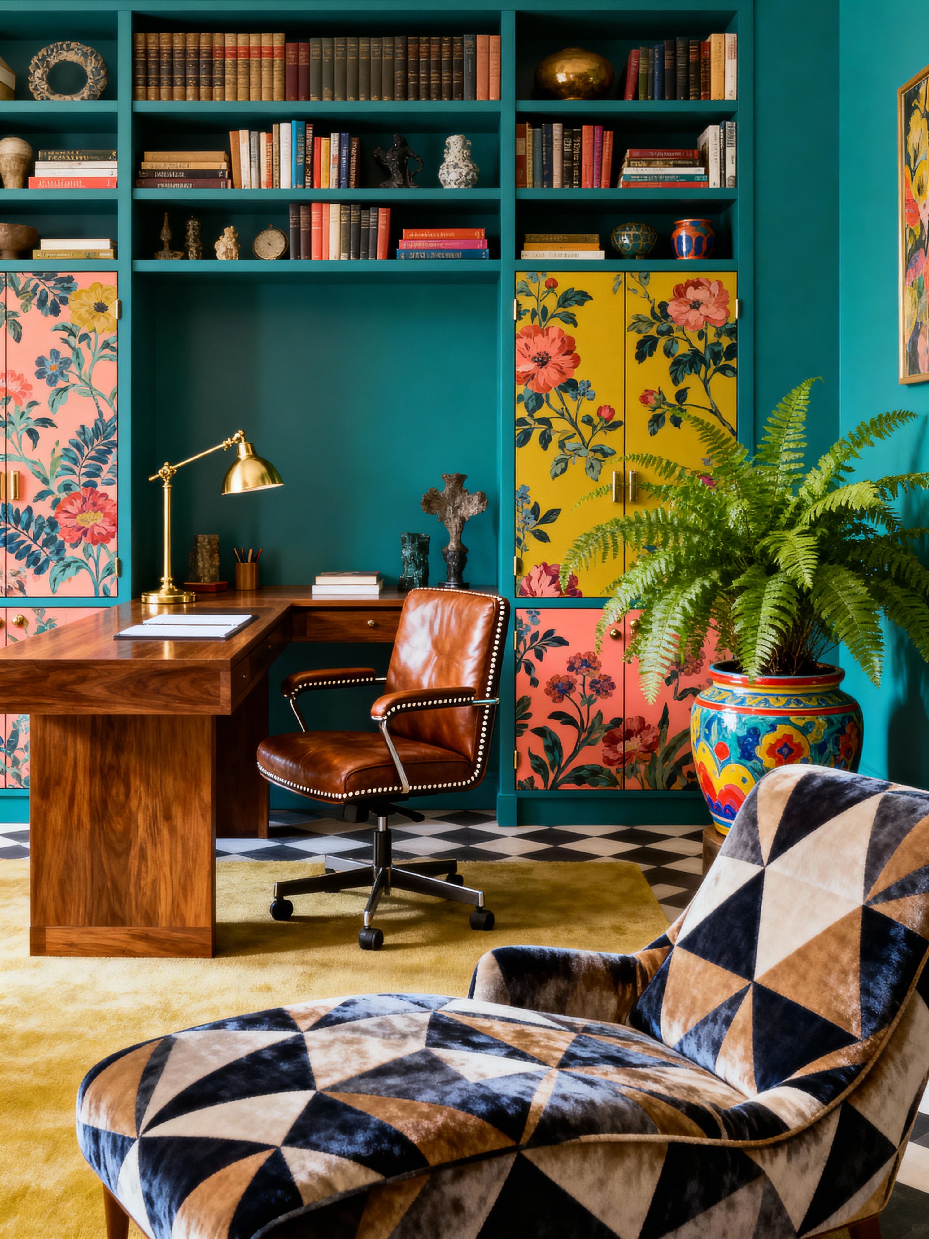 study room with maximalist style with lounge chair and cabinets and plant and office chair and desk lamp and writing desk and bookshelves and lounge chair. . with bold patterns and bold design and eye-catching and more is more philosophy and over-the-top aesthetic and bold creativity and playful and vibrant