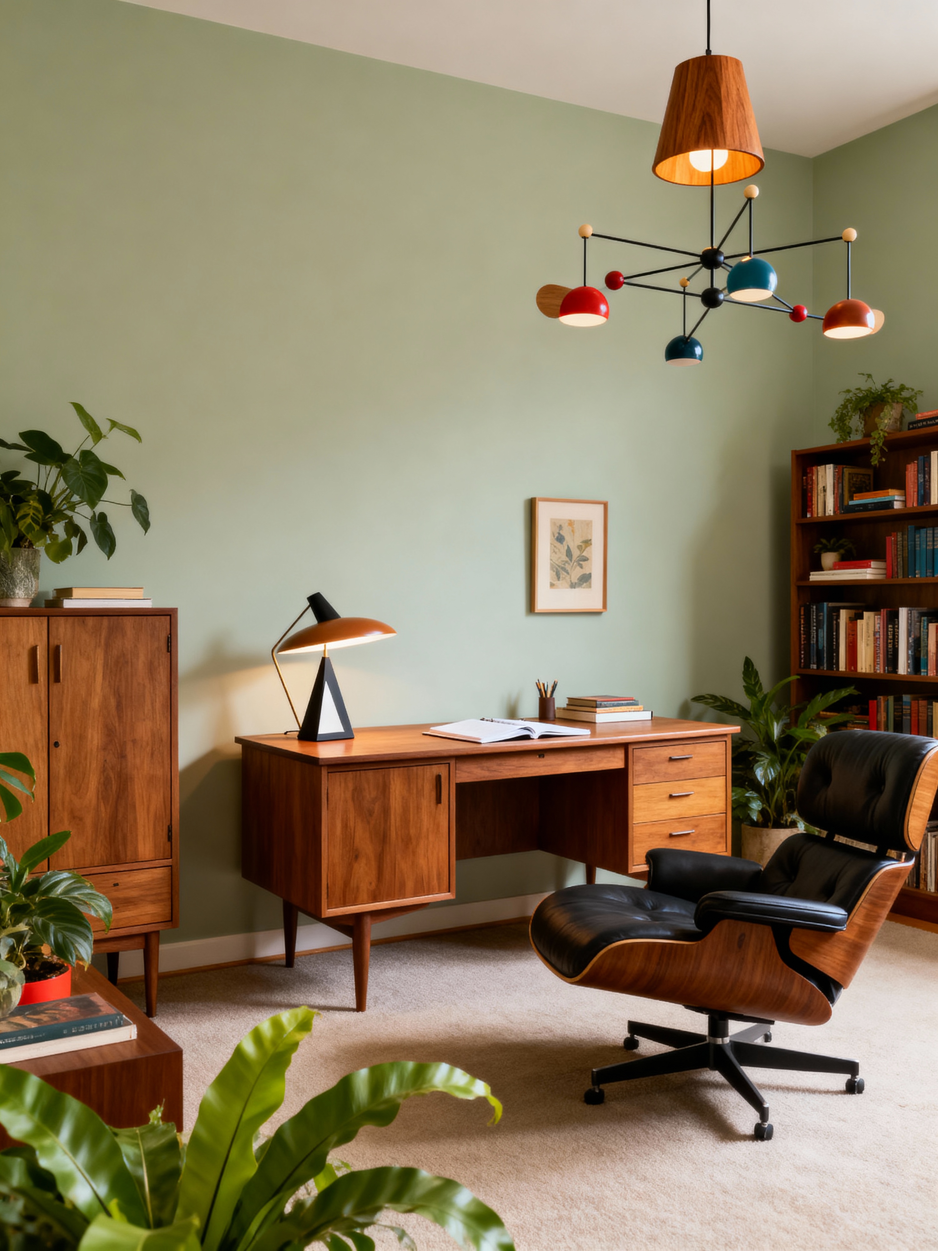study room with midcentury modern style with cabinets and desk lamp and plant and lounge chair and bookshelves and office chair and writing desk and cabinets. . with muted tones and integrating indoor and outdoor motifs and vibrant colors and mid century modern mobile chandelier and organic and geometric shapes and minimalist and function over form and wood pendant light mid century modern chandelier