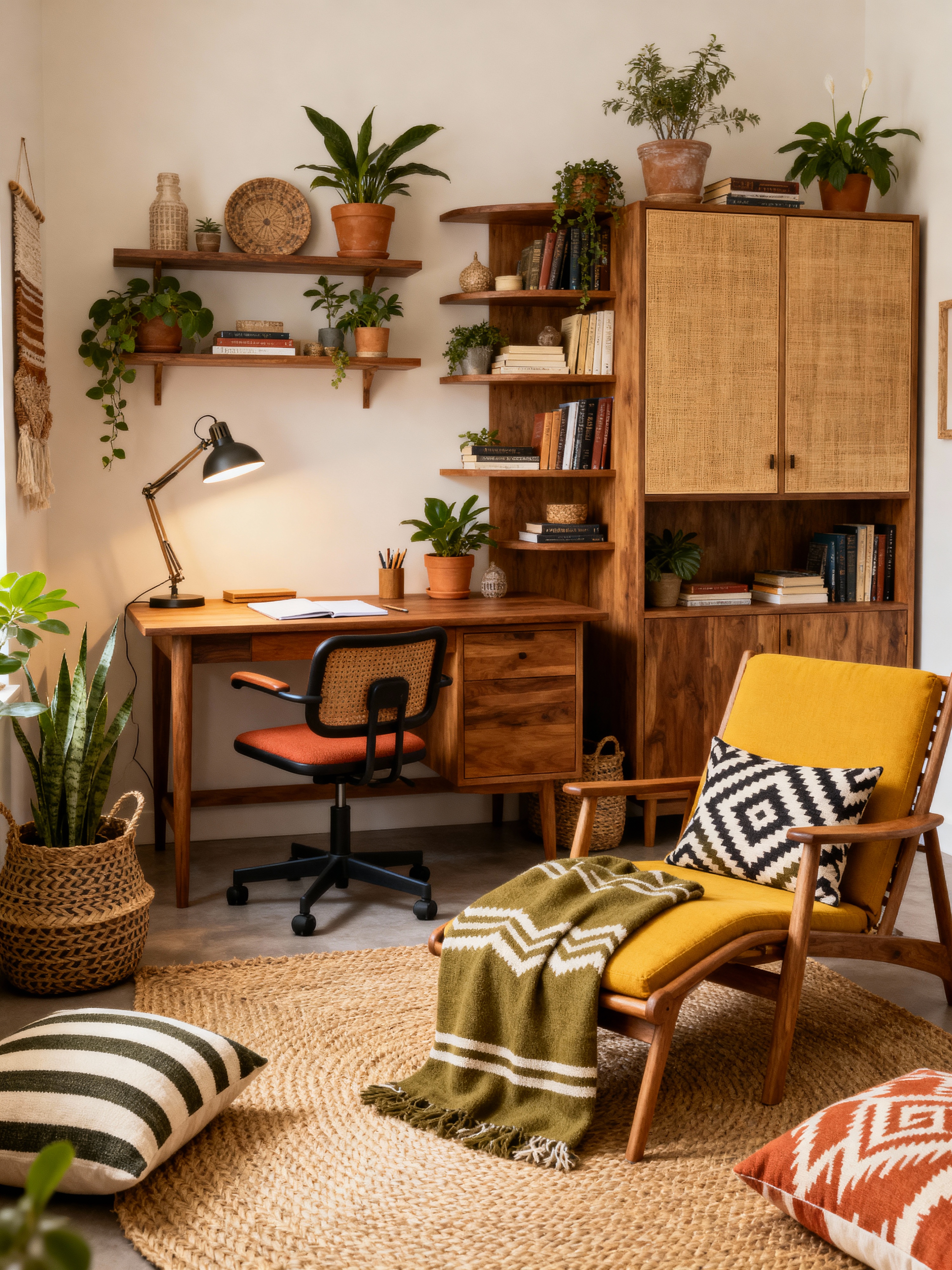 study room with modern boho style with cabinets and lounge chair and office chair and plant and bookshelves and writing desk and desk lamp and cabinets. . with potted plants and earthy tones and patterns and greenery and woven textures and jute rugs and wood decor and comfortable