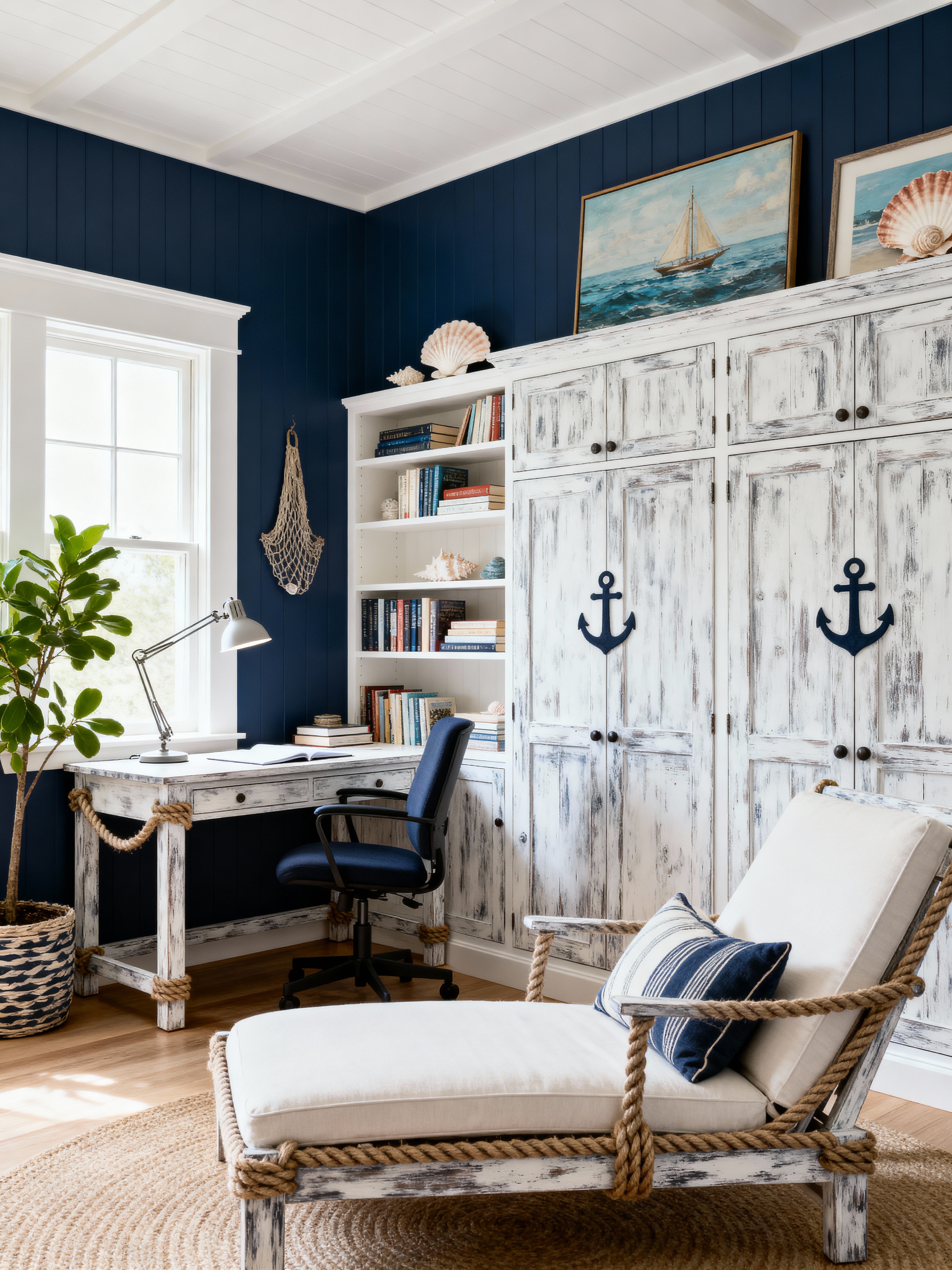 study room with nautical style with writing desk and bookshelves and desk lamp and lounge chair and cabinets and office chair and plant and writing desk. . with navy blue and crisp white and weathered wood and coastal vibes and seaside charm and rope details and anchor motifs and ocean inspiration