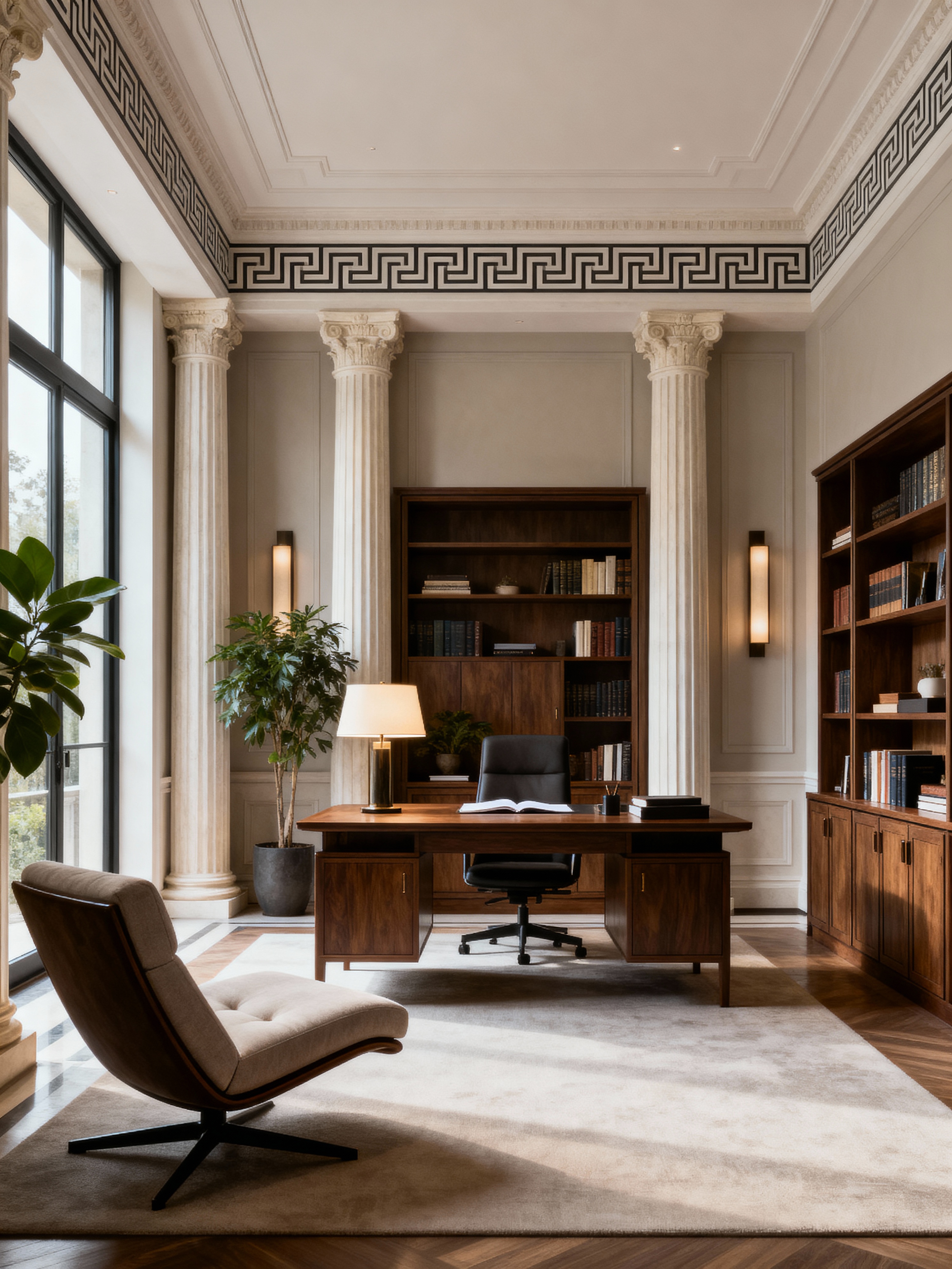 study room with neoclassic style with plant and lounge chair and writing desk and desk lamp and bookshelves and cabinets and office chair and plant. . with classical architectural details and elegant and sophisticated and high ceilings and thoughtful minimalism and geometric decorative elements and spacious rooms and symmetric layouts and greek columns