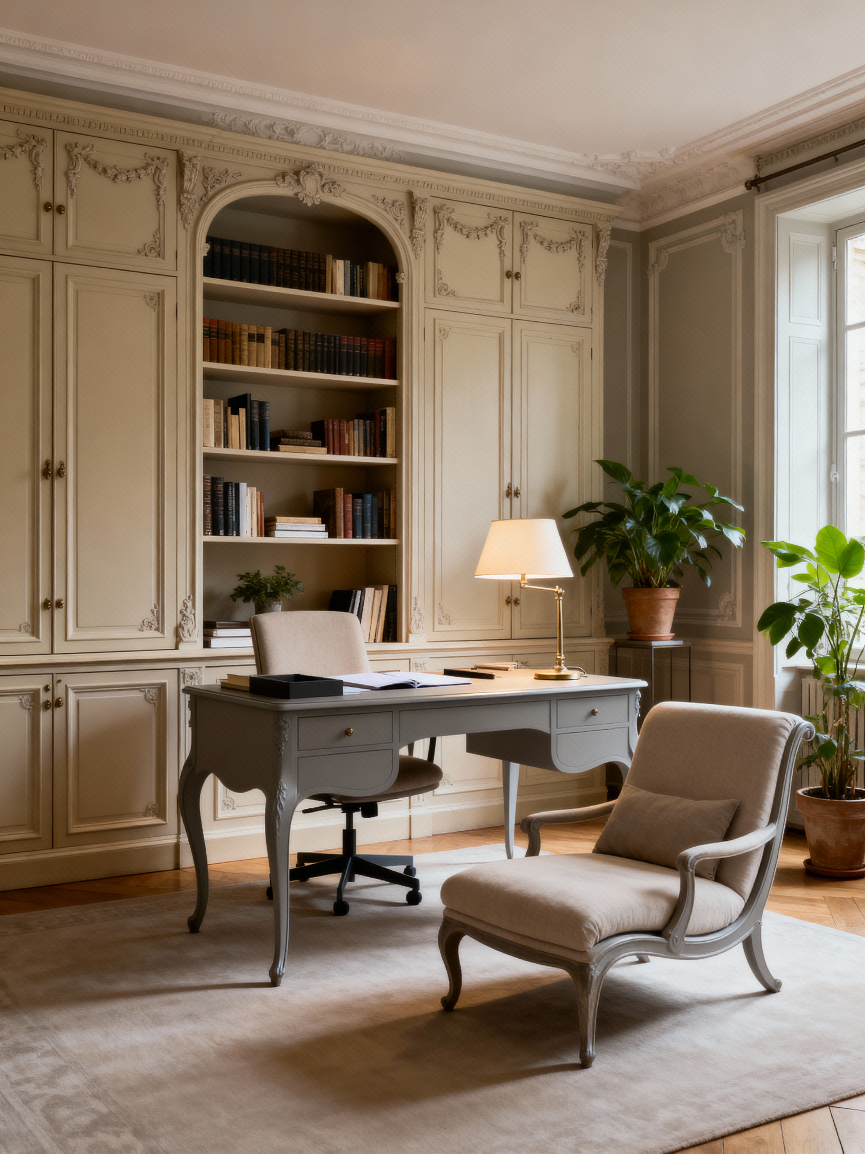 study room with parisian style with cabinets and plant and office chair and bookshelves and lounge chair and desk lamp and writing desk and cabinets. . with chic simplicity and sophisticated charm and french elegance and classic details and timeless beauty and refined style and antique furniture and neutral palette