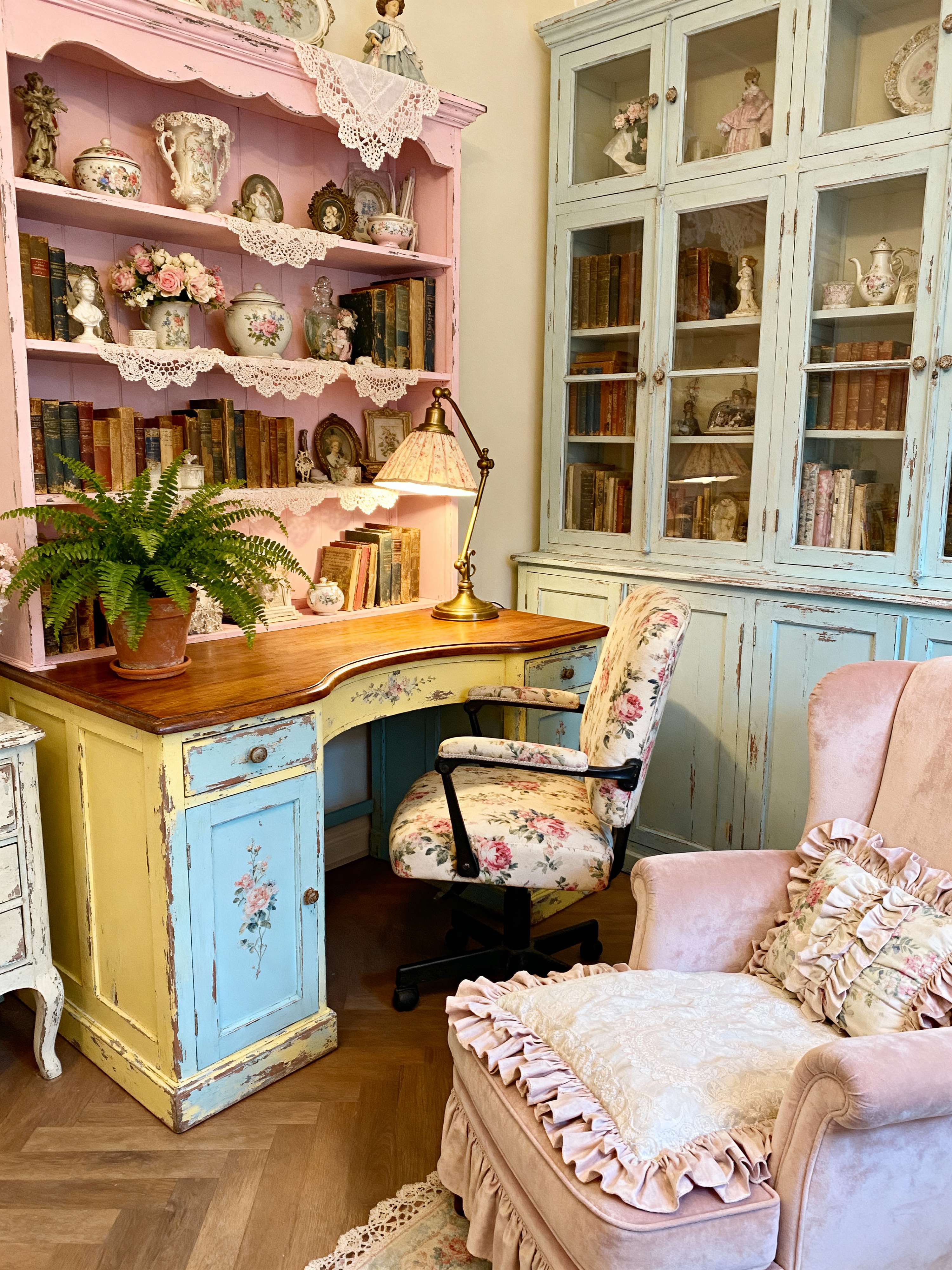 study room with shabby chic style with cabinets and writing desk and bookshelves and desk lamp and plant and office chair and lounge chair and cabinets. . with vintage charm and cottage feel and romantic style and pastel colors and weathered finishes and delicate details and soft textures and distressed furniture