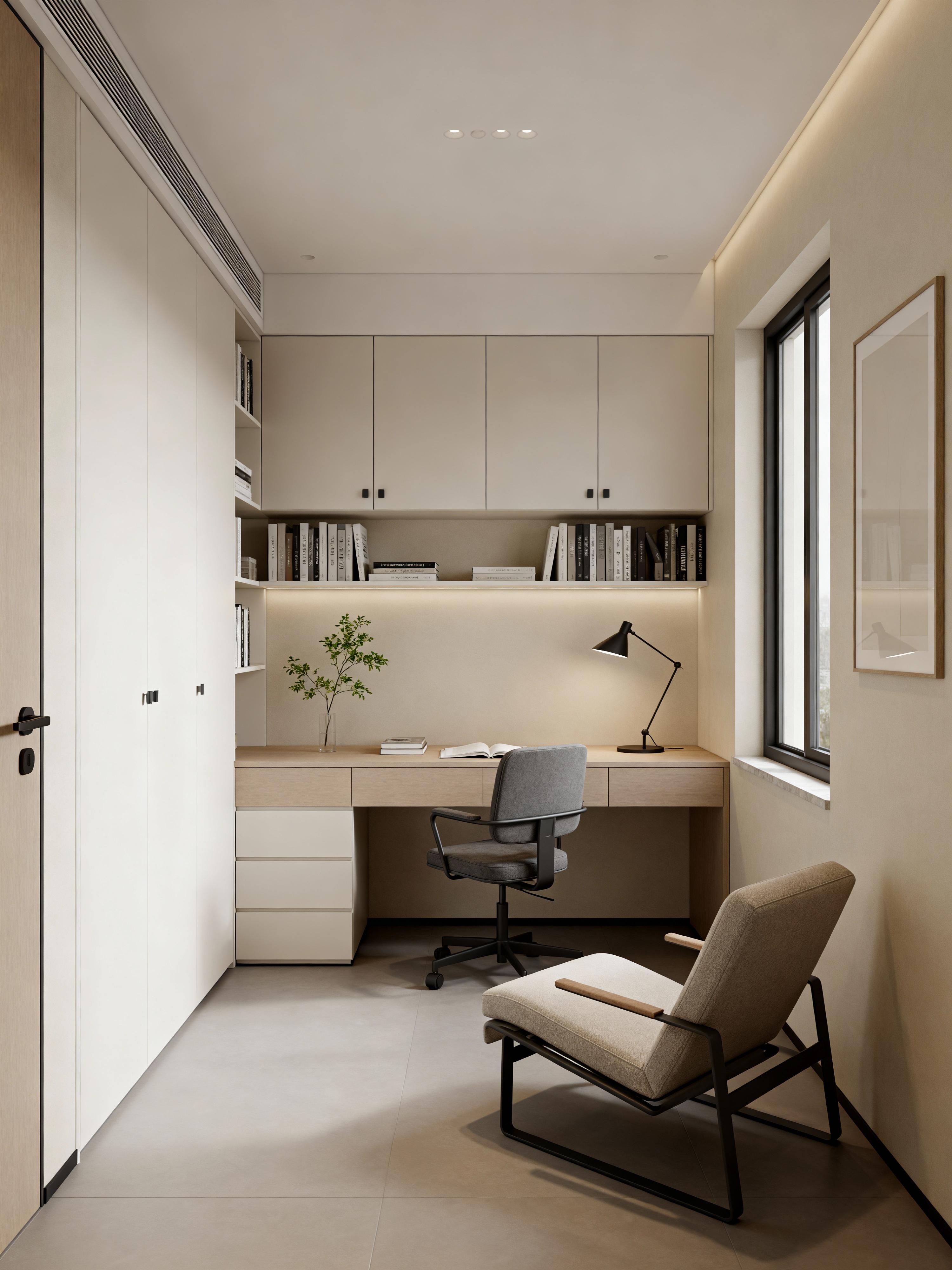 study room with simple style with lounge chair and bookshelves and plant and office chair and desk lamp and cabinets and writing desk and lounge chair. . with minimal decor and functional furniture and neutral colors and streamlined look and understated style and essential pieces and pure simplicity and calm atmosphere