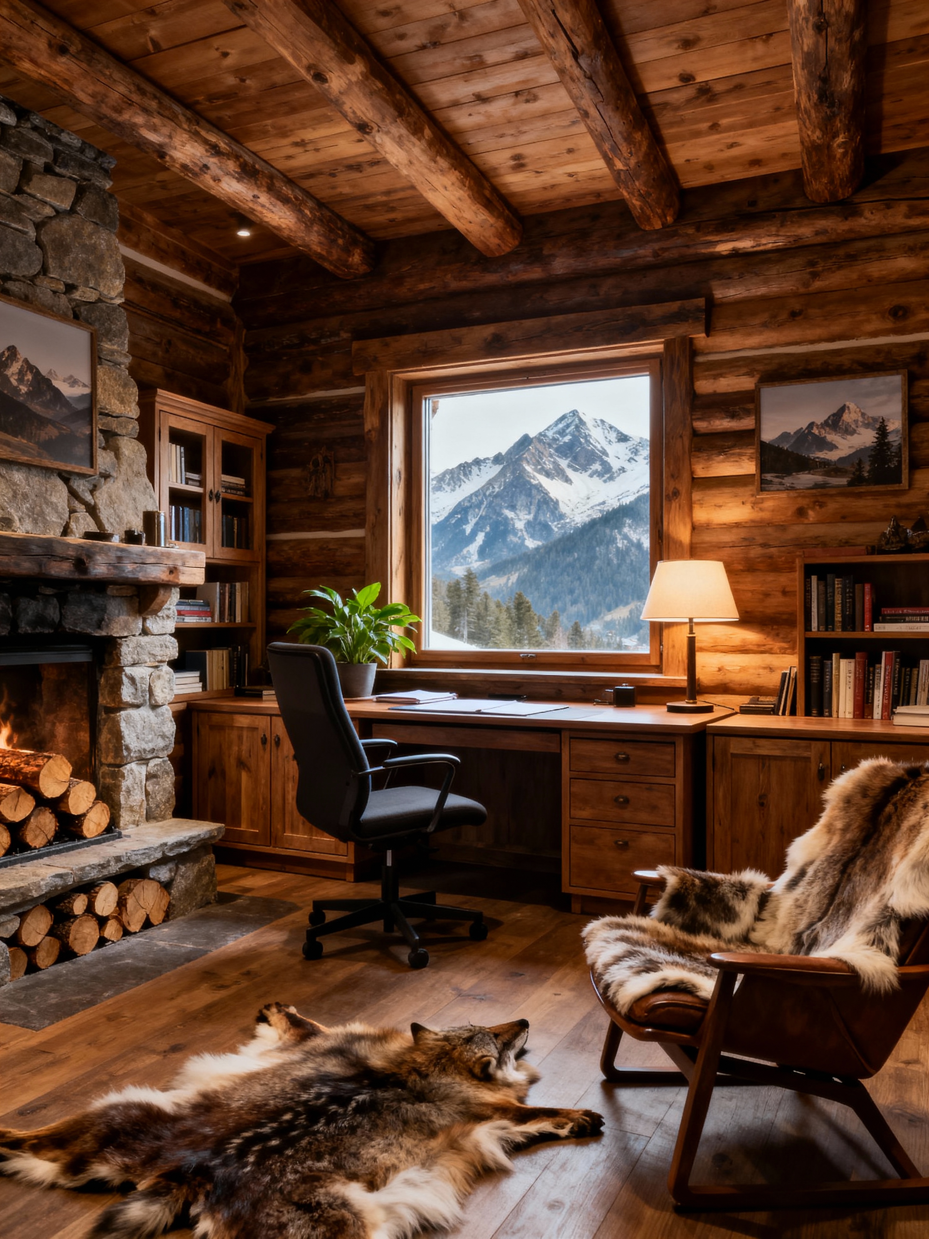 study room with ski chalet style with office chair and cabinets and writing desk and desk lamp and plant and bookshelves and lounge chair and office chair. . with animal furs and stone fireplace and exposed timber and wooden walls and rustic and wooden logs and window with mountain views and mountain-inspired