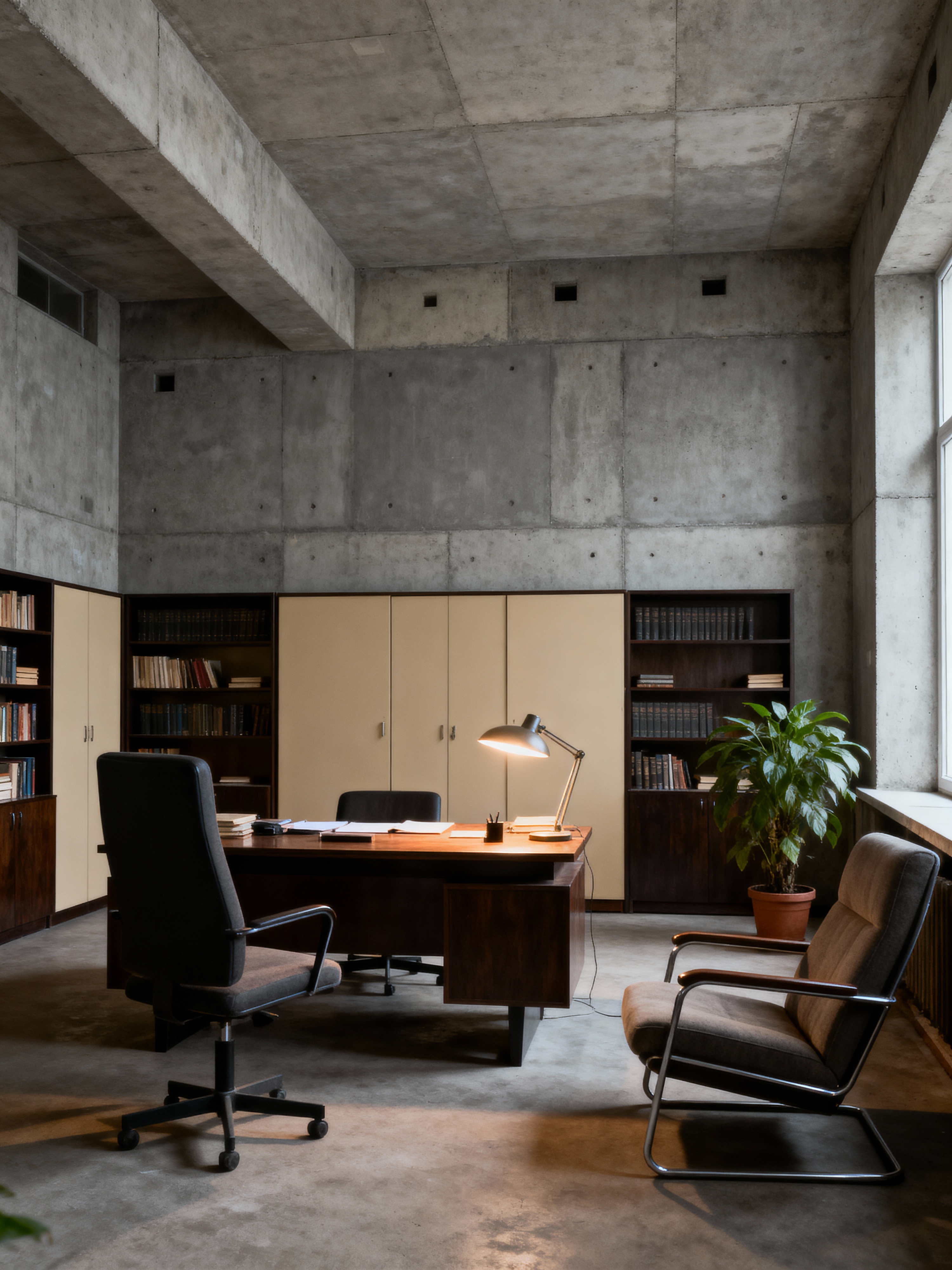 study room with soviet style with desk lamp and plant and lounge chair and cabinets and bookshelves and office chair and writing desk and desk lamp. . with institutional look and utilitarian design and socialist realism and eastern bloc and austere aesthetic and brutalist style and concrete structures and soviet-era architecture