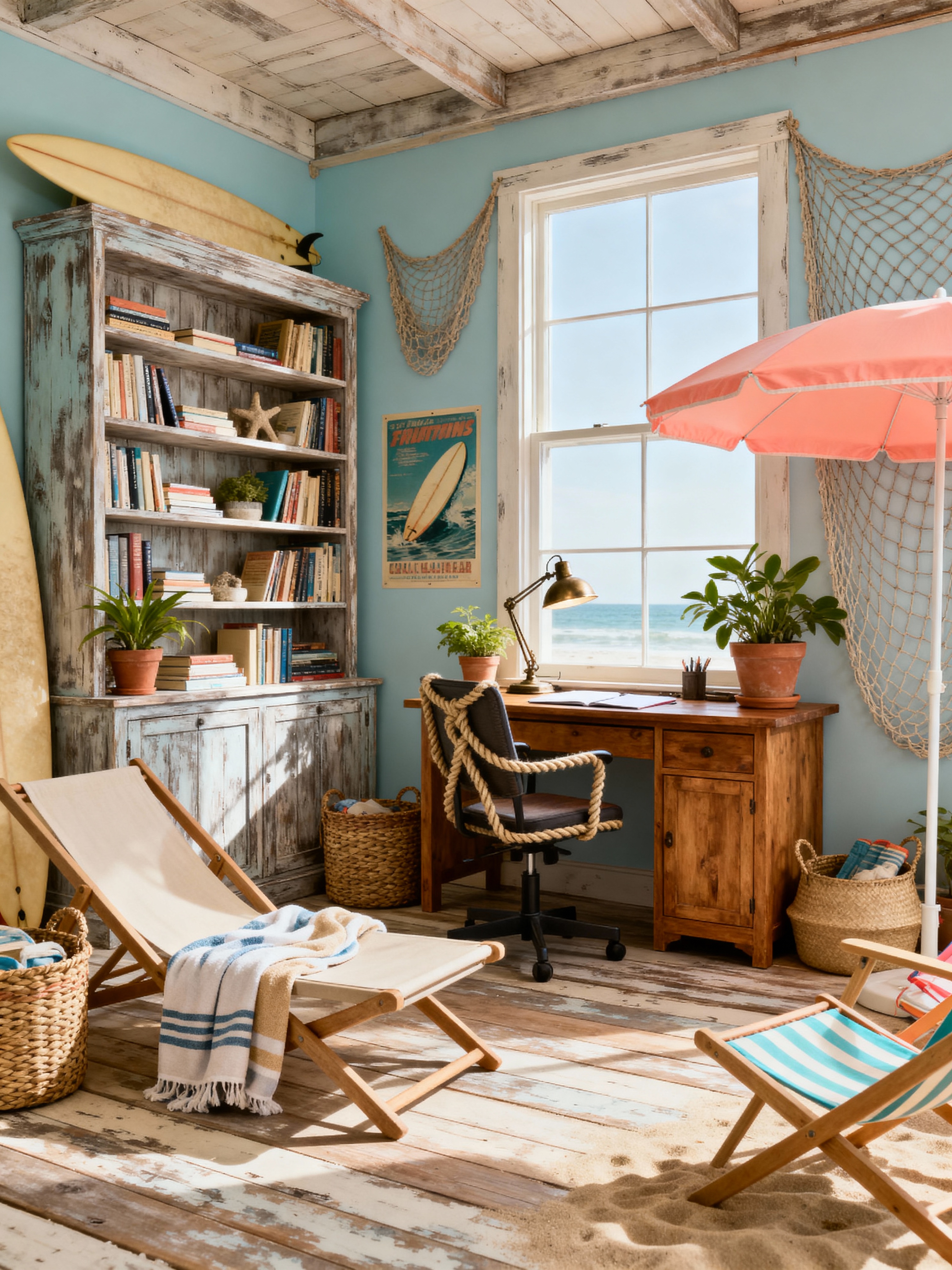 study room with surf shack style with bookshelves and lounge chair and writing desk and desk lamp and cabinets and plant and office chair and bookshelves. . with woven baskets and rope details and beach chairs and beach umbrellas and net decorations and vintage surf posters and beach towels and weathered wood