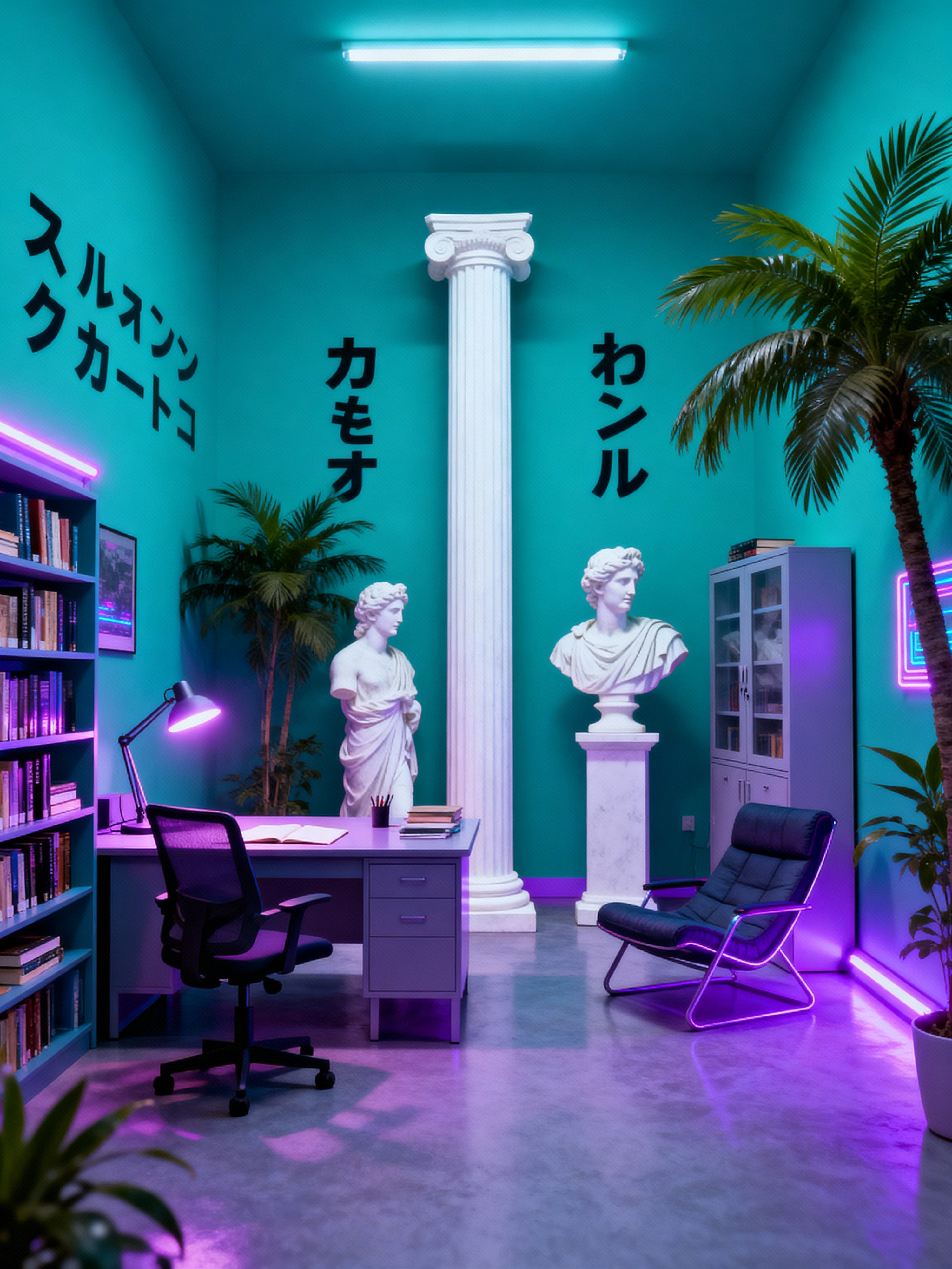 study room with vaporwave style with plant and office chair and bookshelves and lounge chair and desk lamp and writing desk and cabinets and plant. . with teal colors and purple lights and neon glow and japanese letters on wall and palm trees and washed out colors and japanese letters on wall and white roman statues, white roman sculptures, white roman columns, white roman pillars in the center of the room,