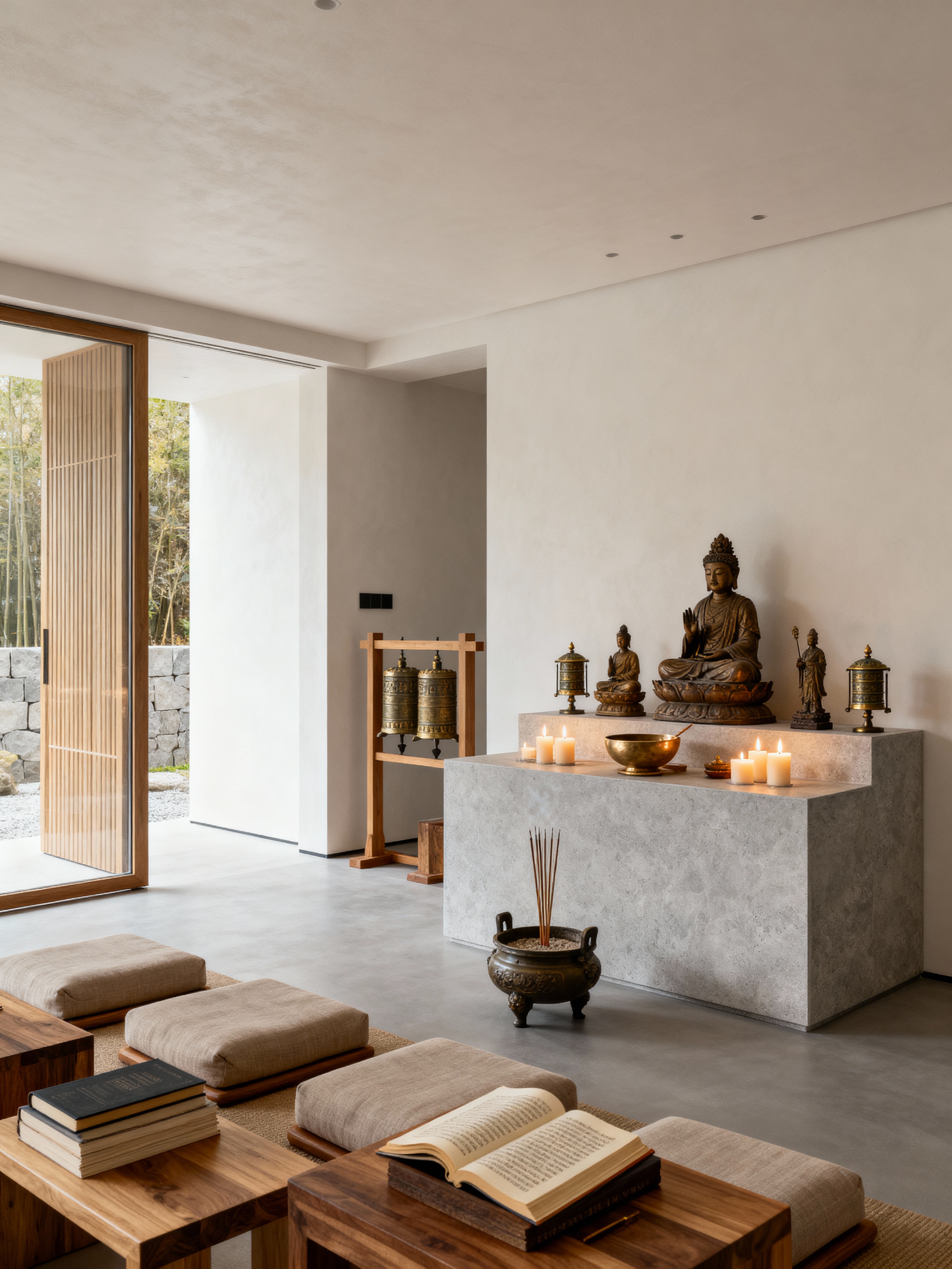 temple with airbnb style with incense burner and religious statues and altar and candles and offerings bowl and prayer wheels and meditation cushions and sacred texts. . with scandinavian style and practicality and functionality and neutral walls and textures and simple, clean lines and simplistic furniture and open and natural lighting and natural materials and elements and simple color palette and scandinavian style