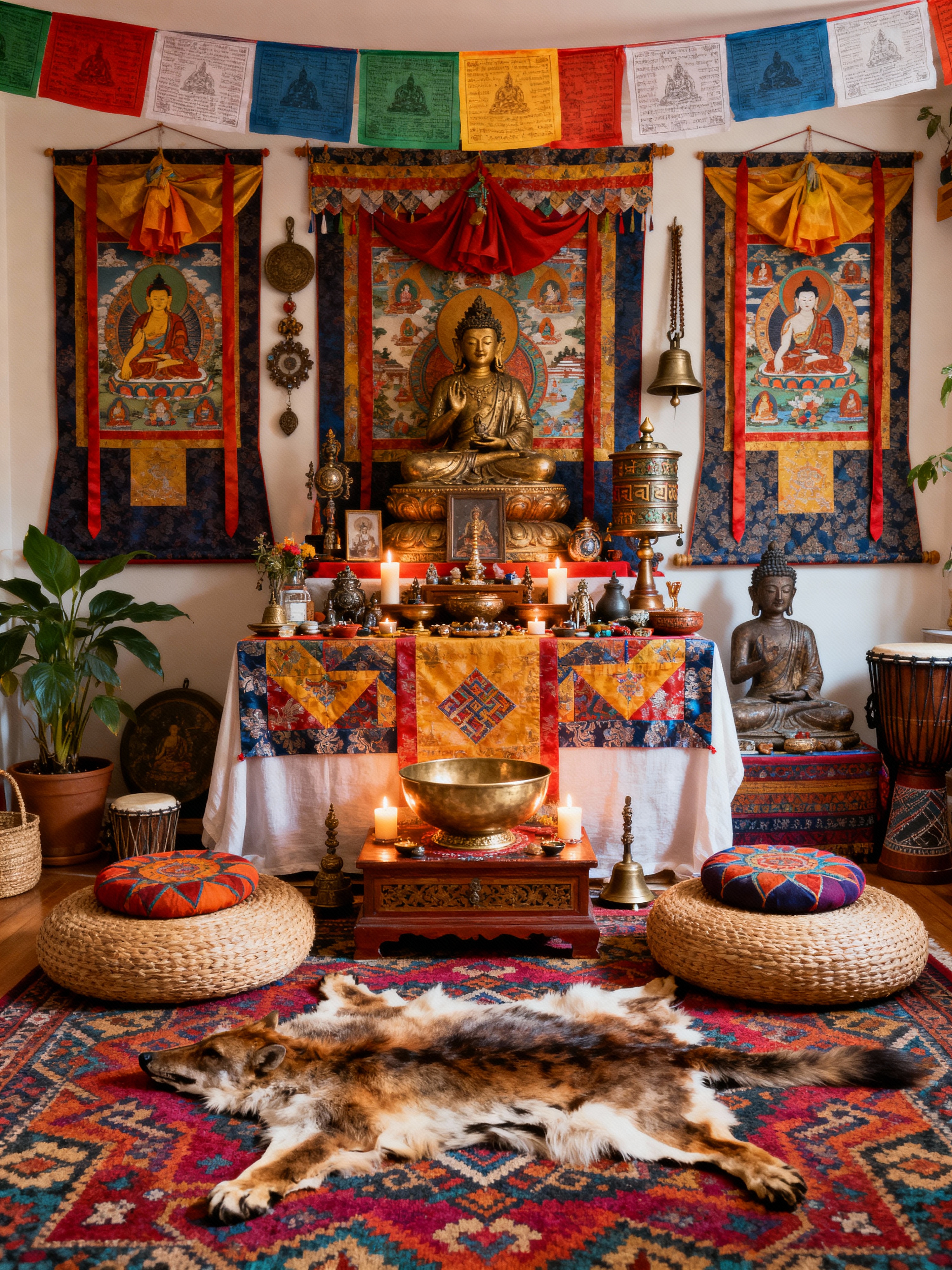 temple with bohemian style with offerings bowl and candles and prayer wheels and altar and prayer flags and meditation cushions and bells and religious statues. . with natural materials and playful colors and playful patterns and travel trinkets and a lack of structure and animal hides and bold colors and bold patterns