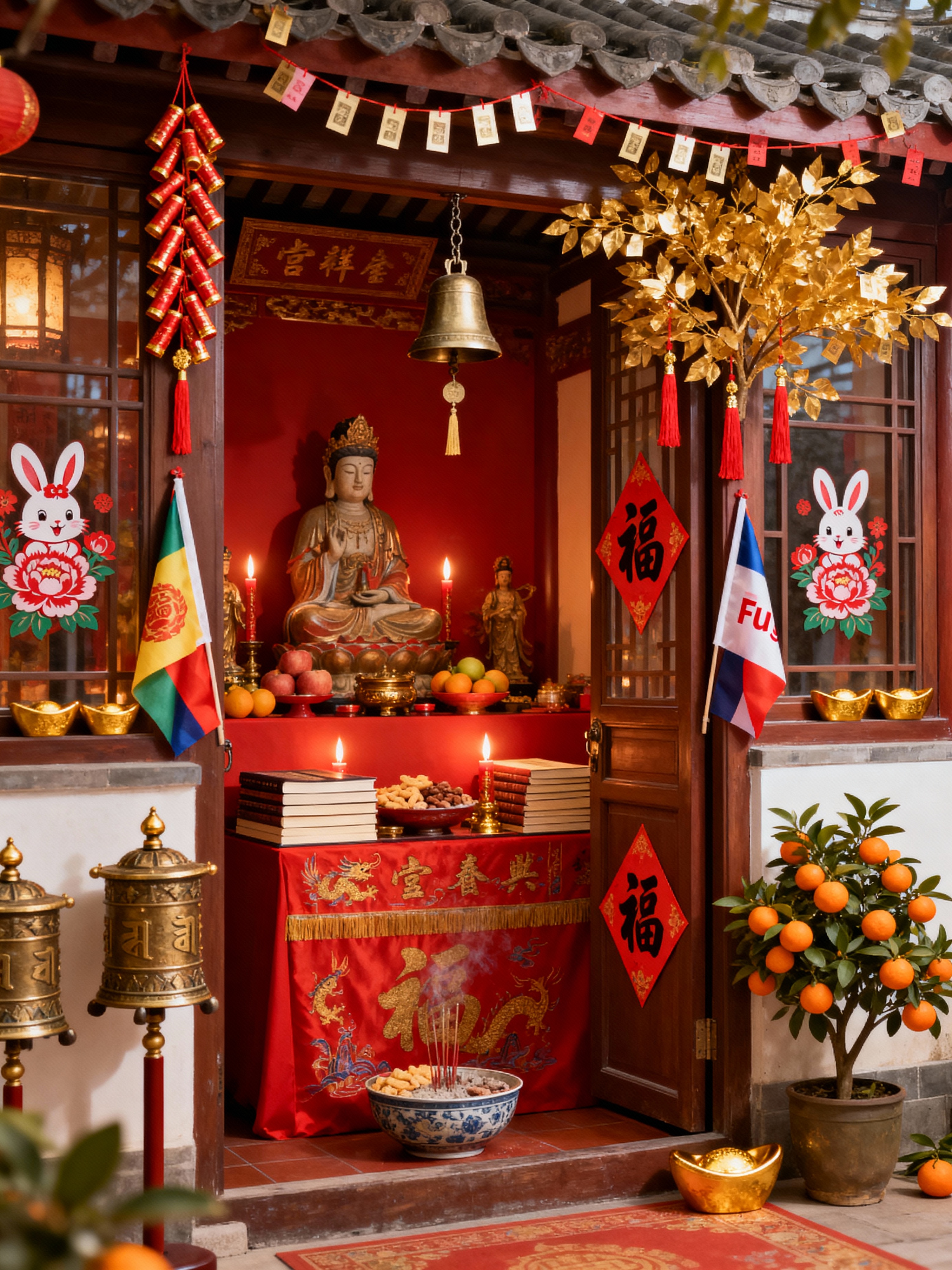 temple with chinese new year style with altar and prayer flags and prayer wheels and offerings bowl and religious statues and candles and bells and sacred texts. . with door couplets and paper cuttings and kumquat trees and paper firecrackers and money tree and red and gold tassels and gold ingots and orange trees