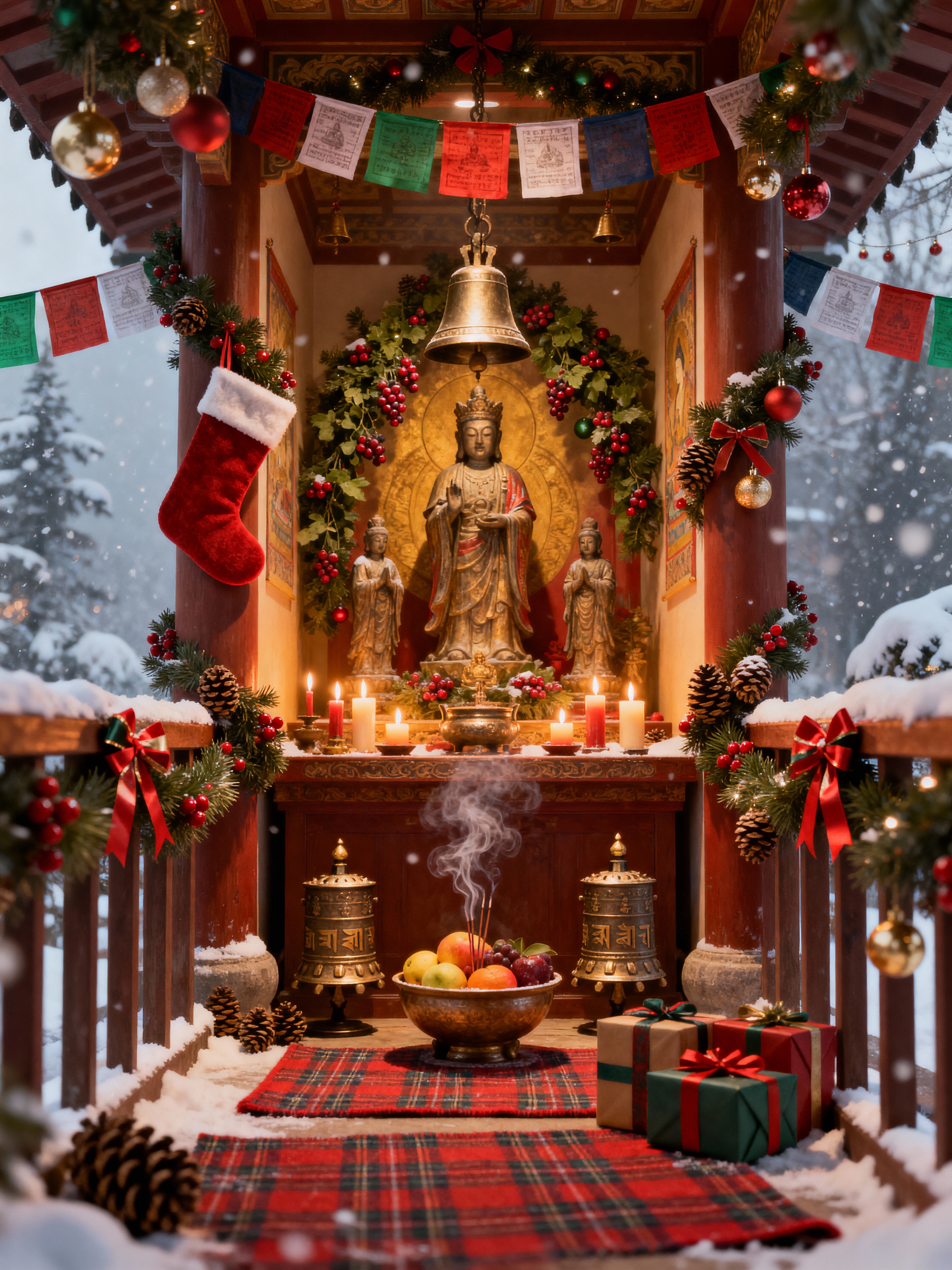 temple with christmas style with bells and candles and religious statues and offerings bowl and prayer flags and incense burner and altar and prayer wheels. . with berries and greenery draped and christmas ornaments and ribbons and snow outside and a few big socks hanging and tie pinecones and berries and giftwrapped gifts and plaid rugs