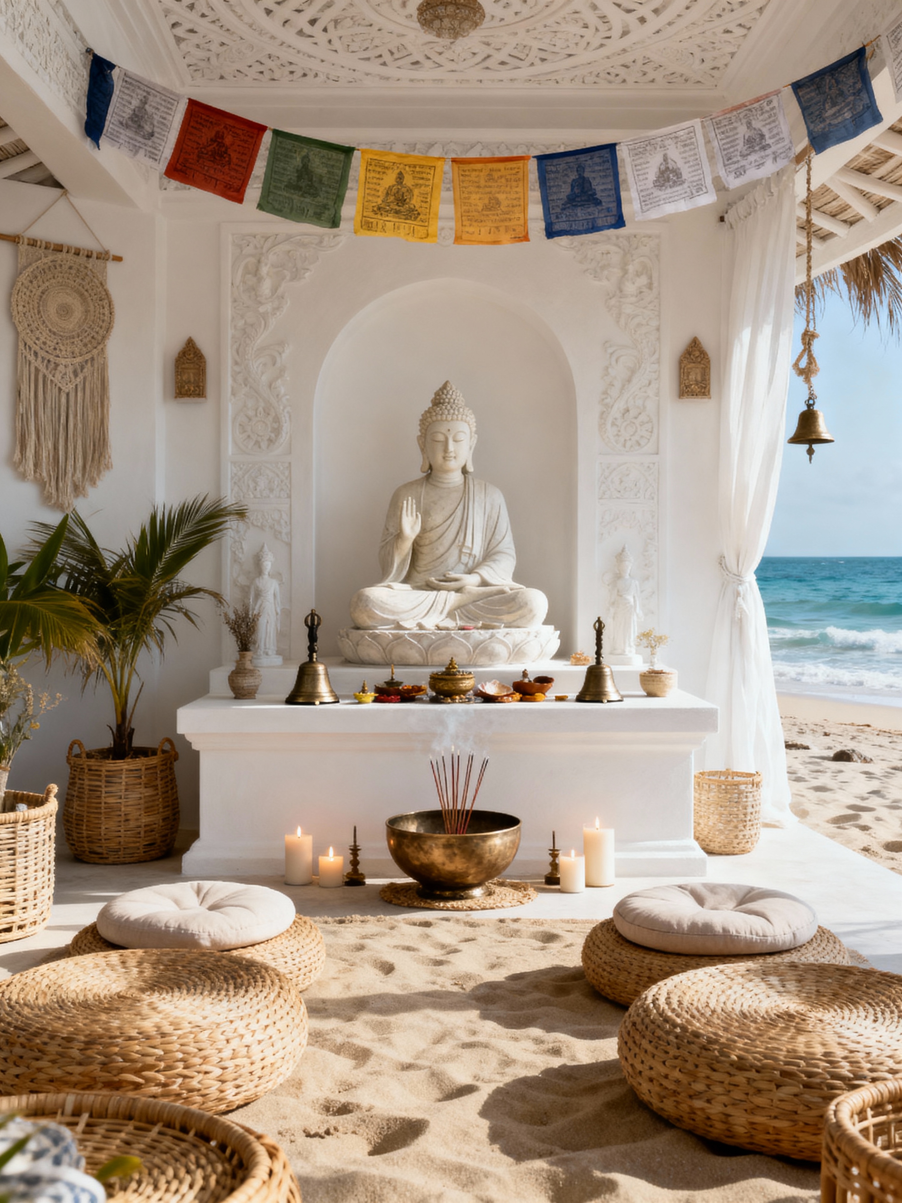 temple with coastal style with altar and religious statues and meditation cushions and incense burner and candles and bells and offerings bowl and prayer flags. . with white decor and ocean-inspired and beach vibes and natural materials and sand tones and nautical decor and wicker furniture and airy feel
