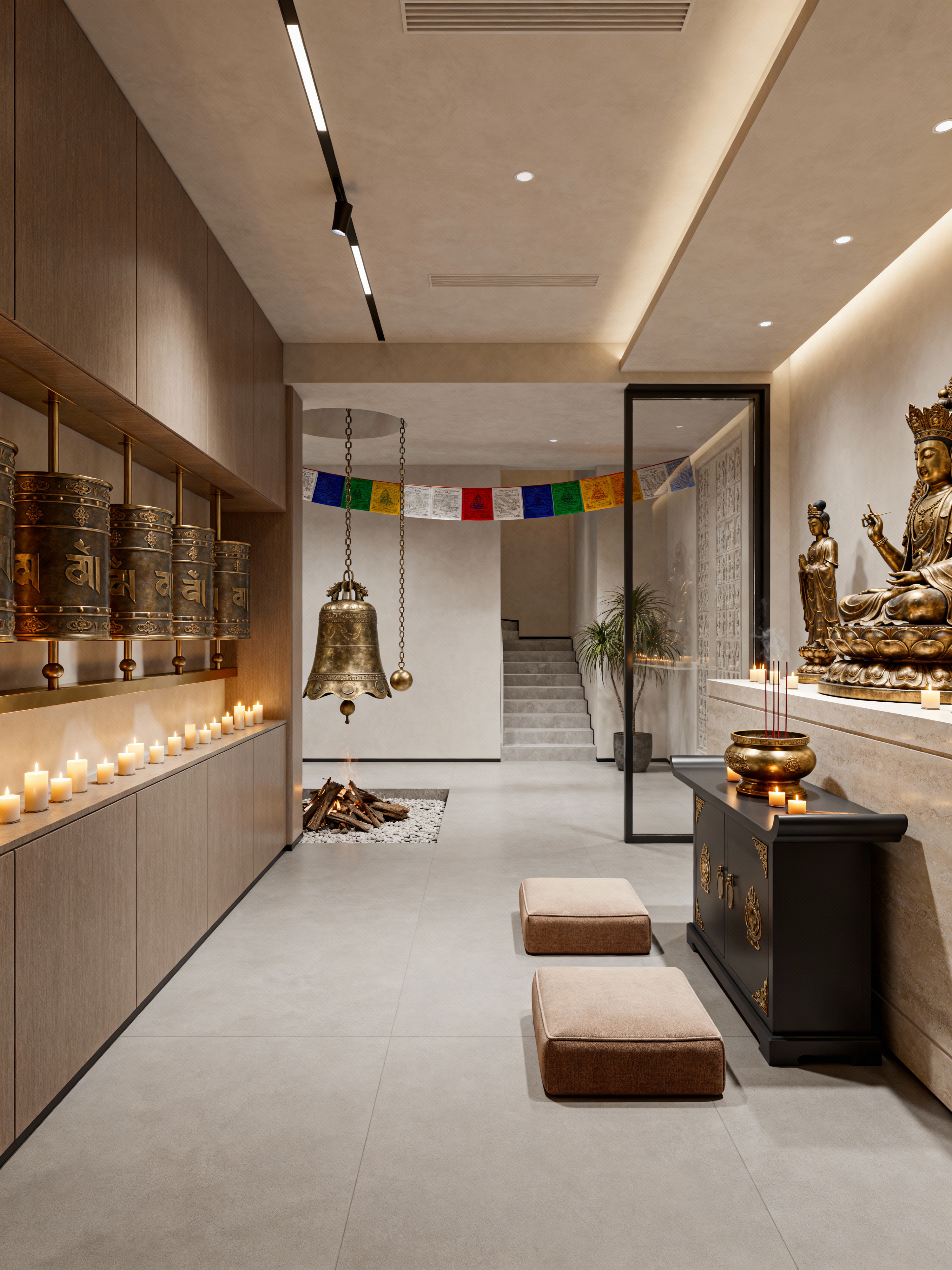temple with contemporary style with candles and prayer wheels and prayer flags and religious statues and meditation cushions and incense burner and bells and altar. . with neutral palette and metal accents and clean look and minimalist and elegant simplicity and sleek lines and modern finishes and functional design